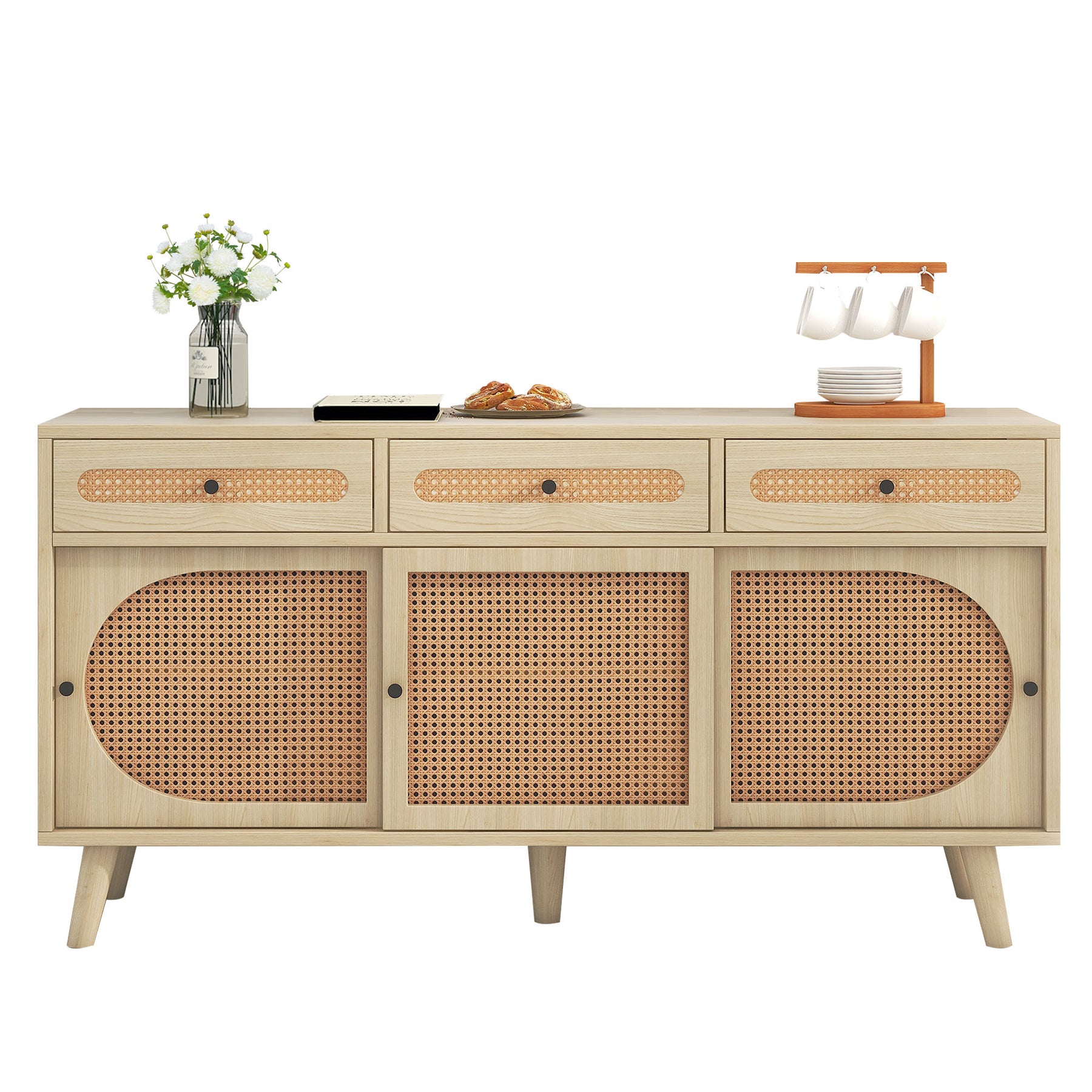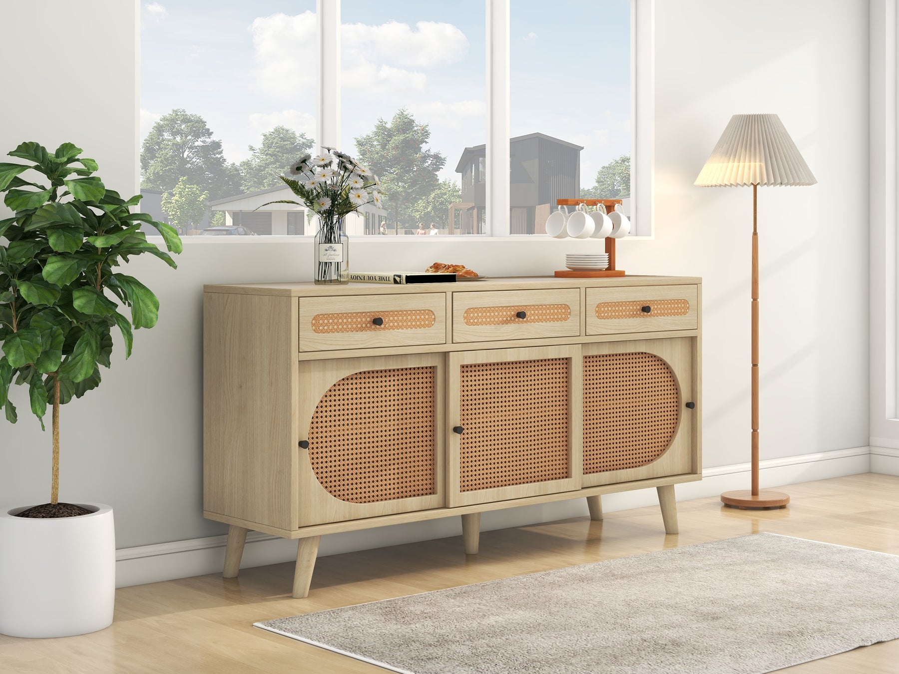 Buffet Chêne Naturel de 140 cm avec Portes en Rotin Synthétique et Rangement Modulable SHAUGRO