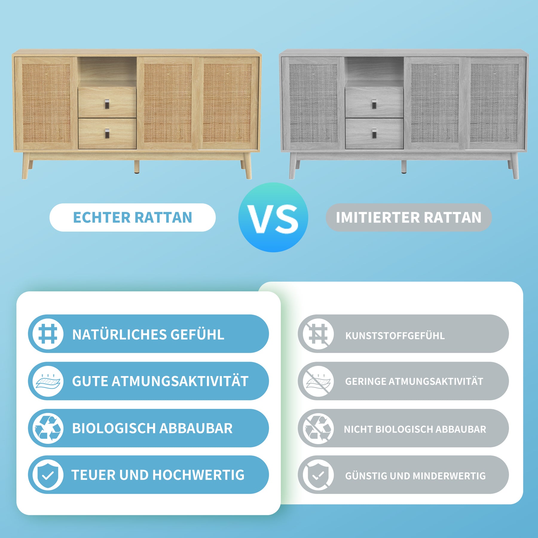 • Rotin Respirant Authentique : Les portes coulissantes en véritable rotin confèrent un aspect haut de gamme au meuble et favorisent la circulation de l'air à l'intérieur des compartiments.
