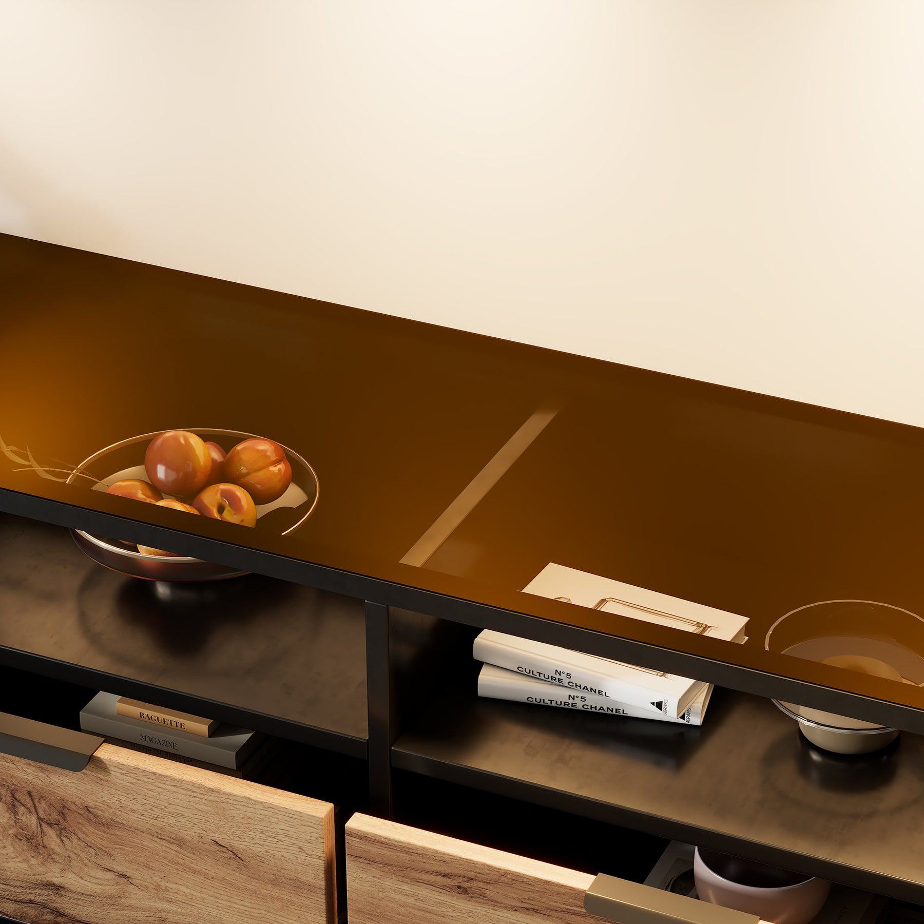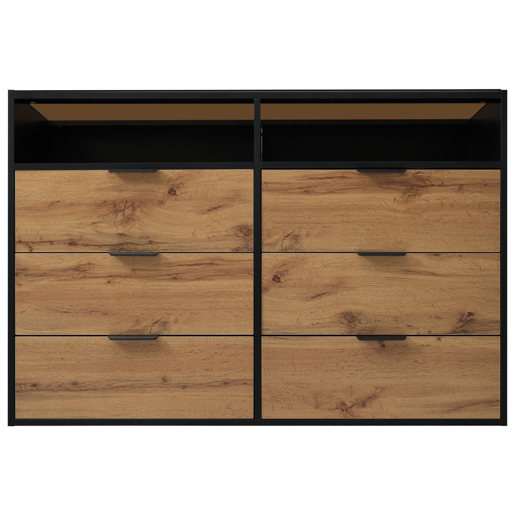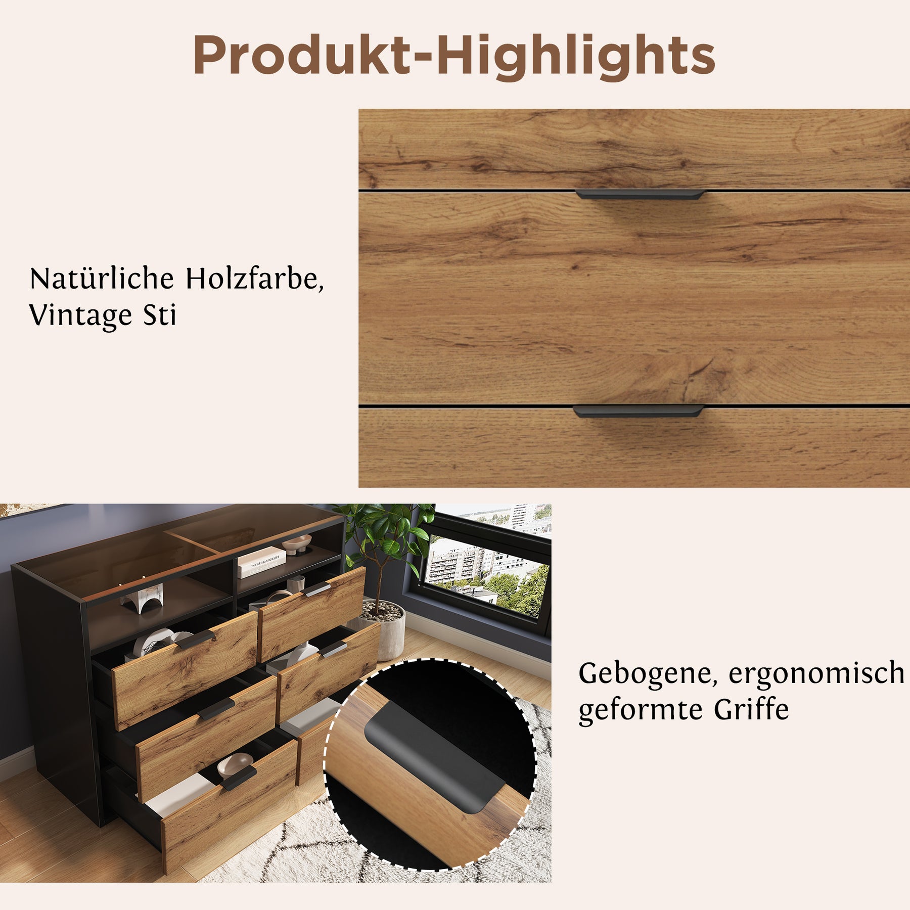 Commode / Buffet Moderne Chêne avec 6 Tiroirs et Surfaces Ouvertes, Plateau en Verre Trempé et Sécurité Anti-Basculement (120x40x80cm) STOKVANS