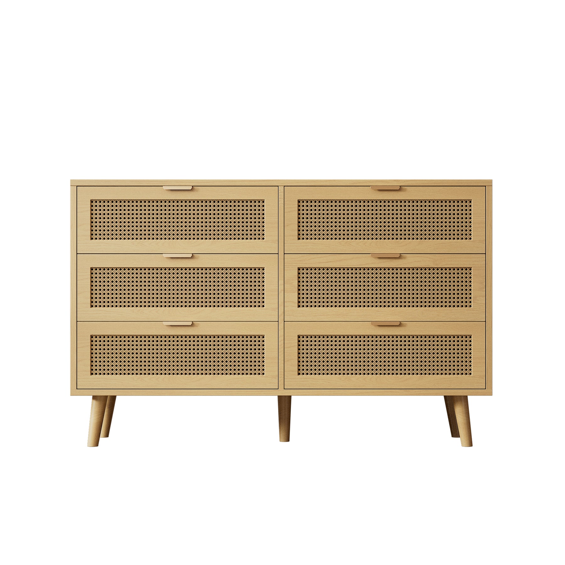 Commode Rétro Élégante en Chêne avec 6 Tiroirs en Rotin et Pieds en Bois Massif KRAUTIX