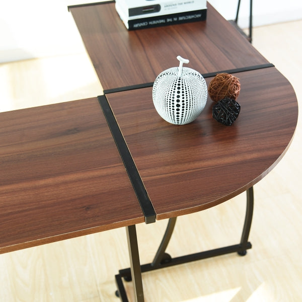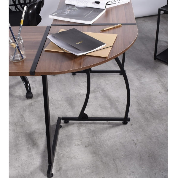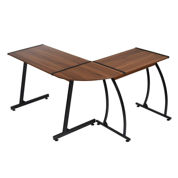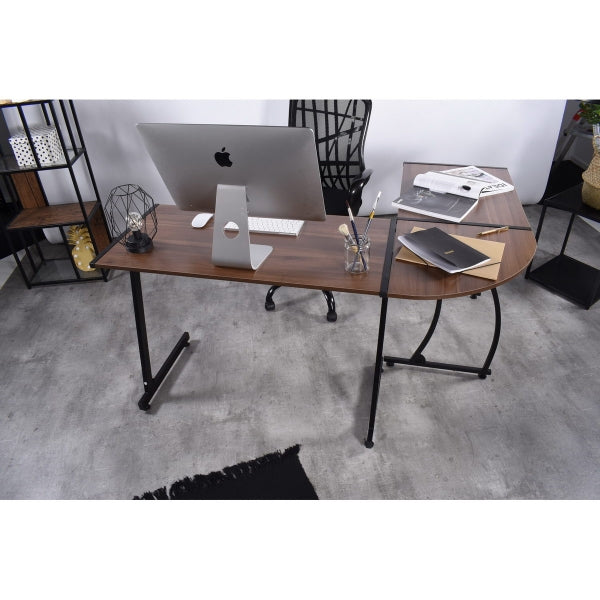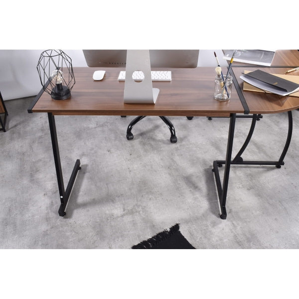 Corner computer desk, product size:147*112*74cm , PB+walnut PVC finished, white metal tube with powder coated finished.1pcs/ctn, Brown box with line-drawing