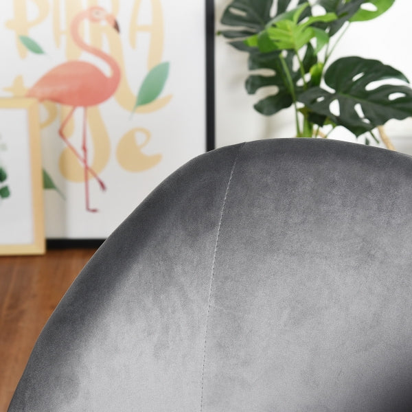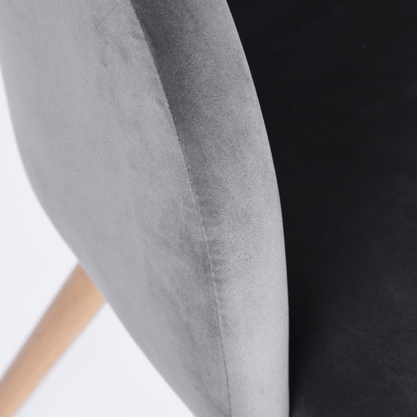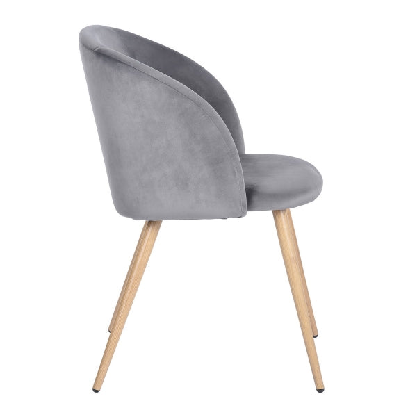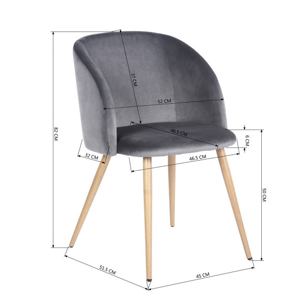 LEISURE CHAIR; Product size: W53.5*D59*H82CM; Seat and back in Grey#40 velvet.Metal Leg in wooden color of Transfer printing.Seat width: 48CM; Seat depth: 46CM; BACK Height: 38CM; 1PC/CTN; Velvet material fullfill Reach test requirement; Brown mailbox in line draw.