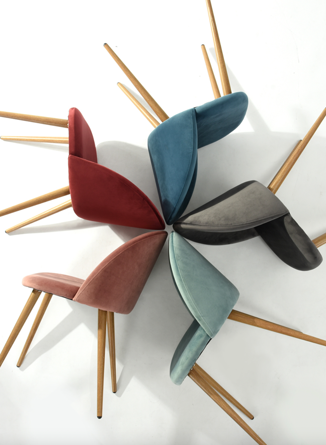 This Scandinavian upholstered chair, with velvet upholstery and metal legs in oak wood color. An ultra cute chair with its rounded back and 4 angled legs, which recall the cocooning and warm look of Nordic furniture.