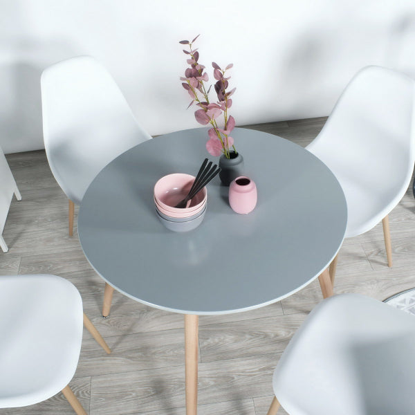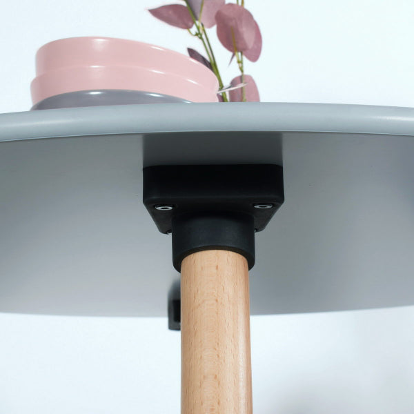 Product size: 80*80*72HCM, Material: 15MM MDF round top with grey(#80041) UV painting and bottom with Melamine, solid round beech wood legs