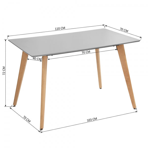 Product size: 110*70*72HCM, Material: 15MM MDF top with UV painting and bottom with Melamine, steel tube frame 30*15*1.2MM and solid square beech wood legs