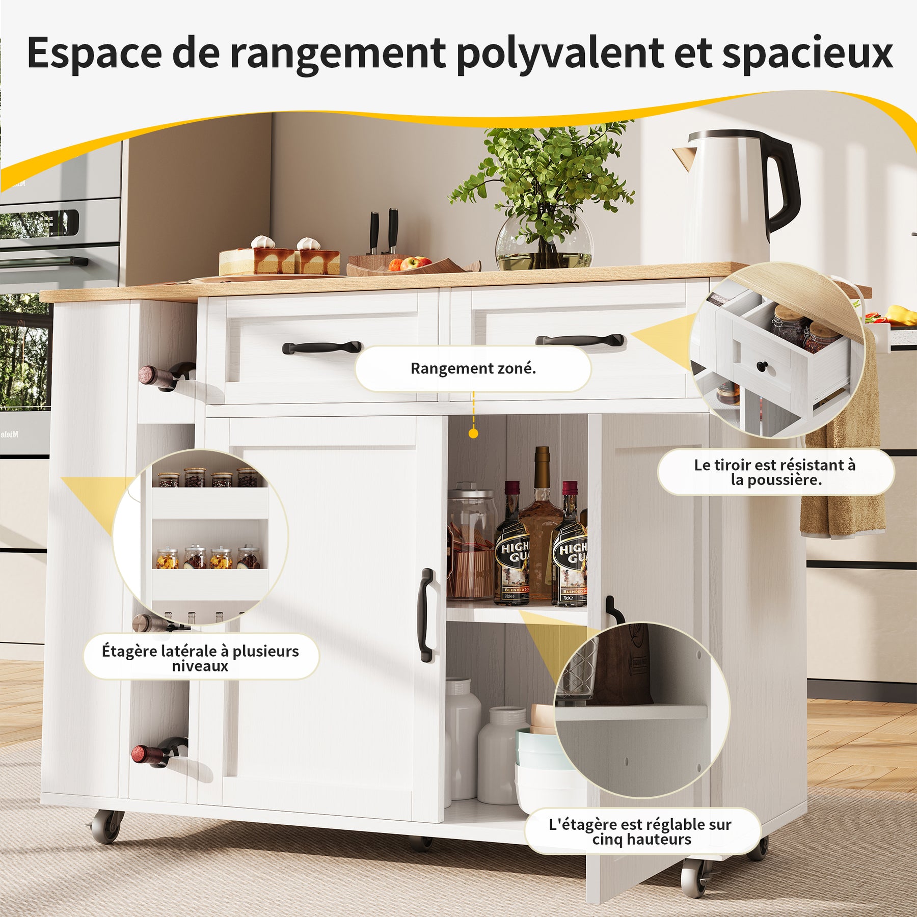 • Design Pliable Unique et Gain de Place : Doté d'un design ingénieux avec un plateau rabattable sur le côté, cet îlot de cuisine se transforme facilement en table à manger (longueur totale de 76 cm une fois déplié), offrant une solution optimale pour maximiser l'espace dans votre cuisine.