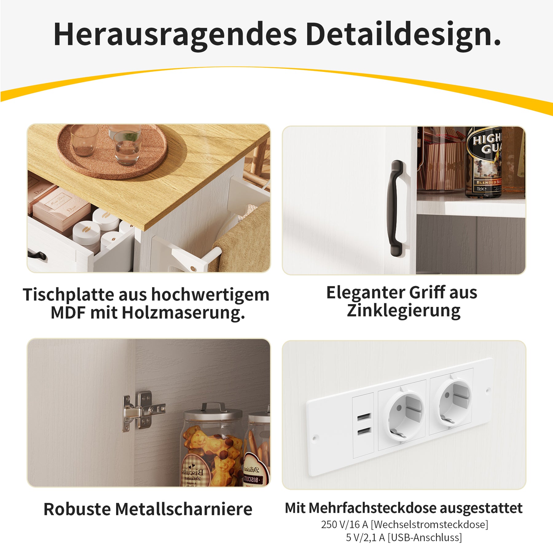 Cet îlot de cuisine mobile blanc et naturel de 131,5 x 43 x 90,7 cm (plié) est une solution polyvalente et pratique pour votre cuisine. Son design compact comprend un plateau rabattable unique qui, une fois déplié, transforme l'îlot en une table à manger spacieuse d'une longueur totale de 76 cm. Équipé de prises électriques sur le côté, il facilite le branchement de divers appareils de cuisine. Il offre un espace de rangement considérable avec deux tiroirs, deux compartiments de placard et plusieurs étagères latérales. Sa conception amovible avec cinq roulettes (dont deux verrouillables) assure flexibilité et stabilité, rendant ce chariot de service idéal pour l'organisation et la mobilité dans votre cuisine.