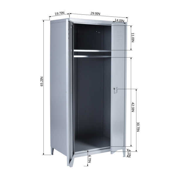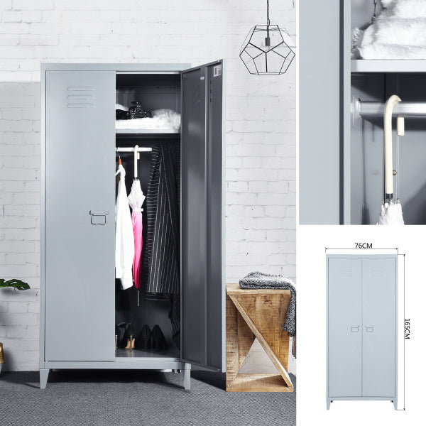 Metal Cabinet Size: W76*D50*H165CM; 0.6 mm steel plate for top and side with dark grey powder coating , with 2 doors, 1 shelf and 1 clothes rail.1 pc/ ctn, 200Lbs brown box with line drawing, with drop test. |