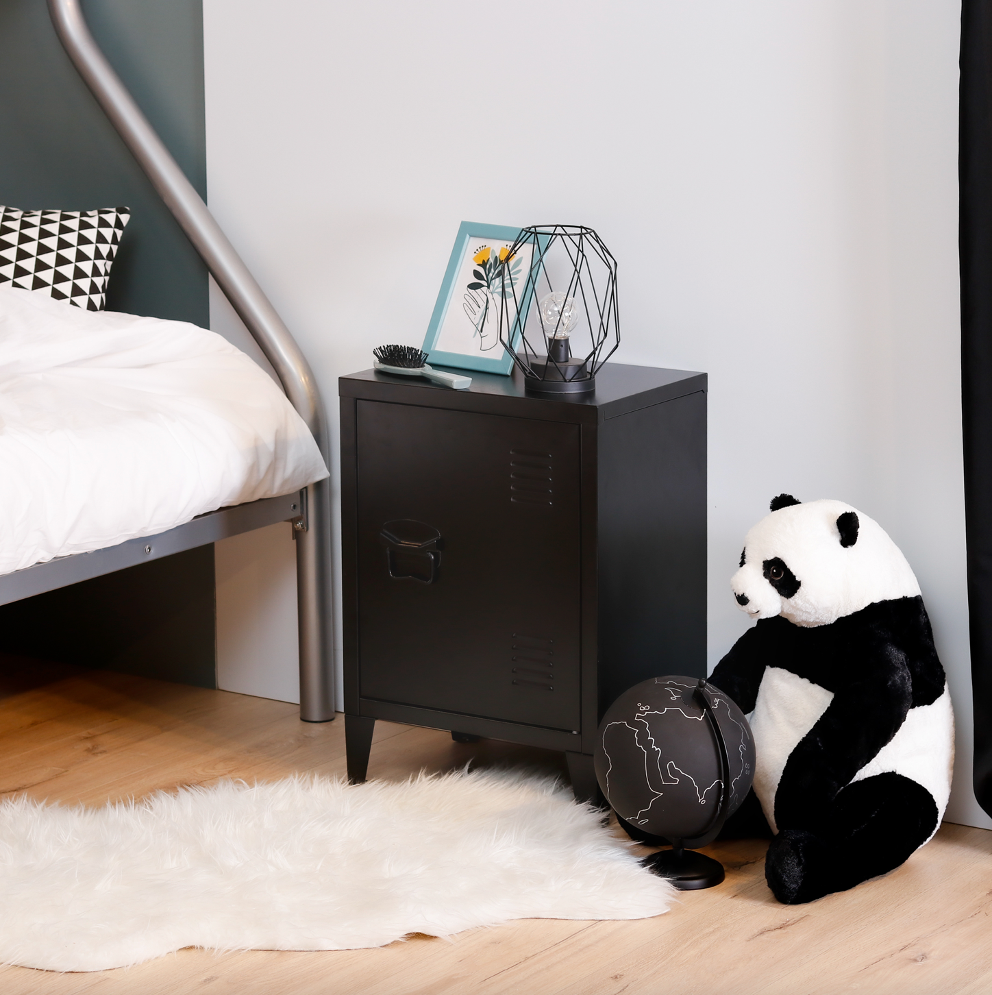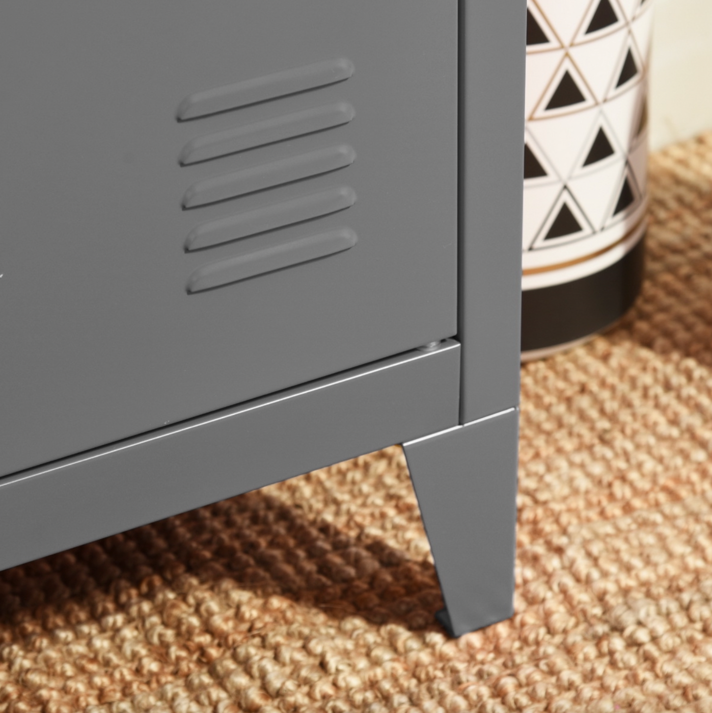 Compact yet spacious, this metal storage unit features sturdy construction with sturdy metal legs and a glossy, epoxy finish that gives it a great look. Lots of style for this small side cabinet, an industrial locker room style storage. The door is secured with a metal handle for easy opening.