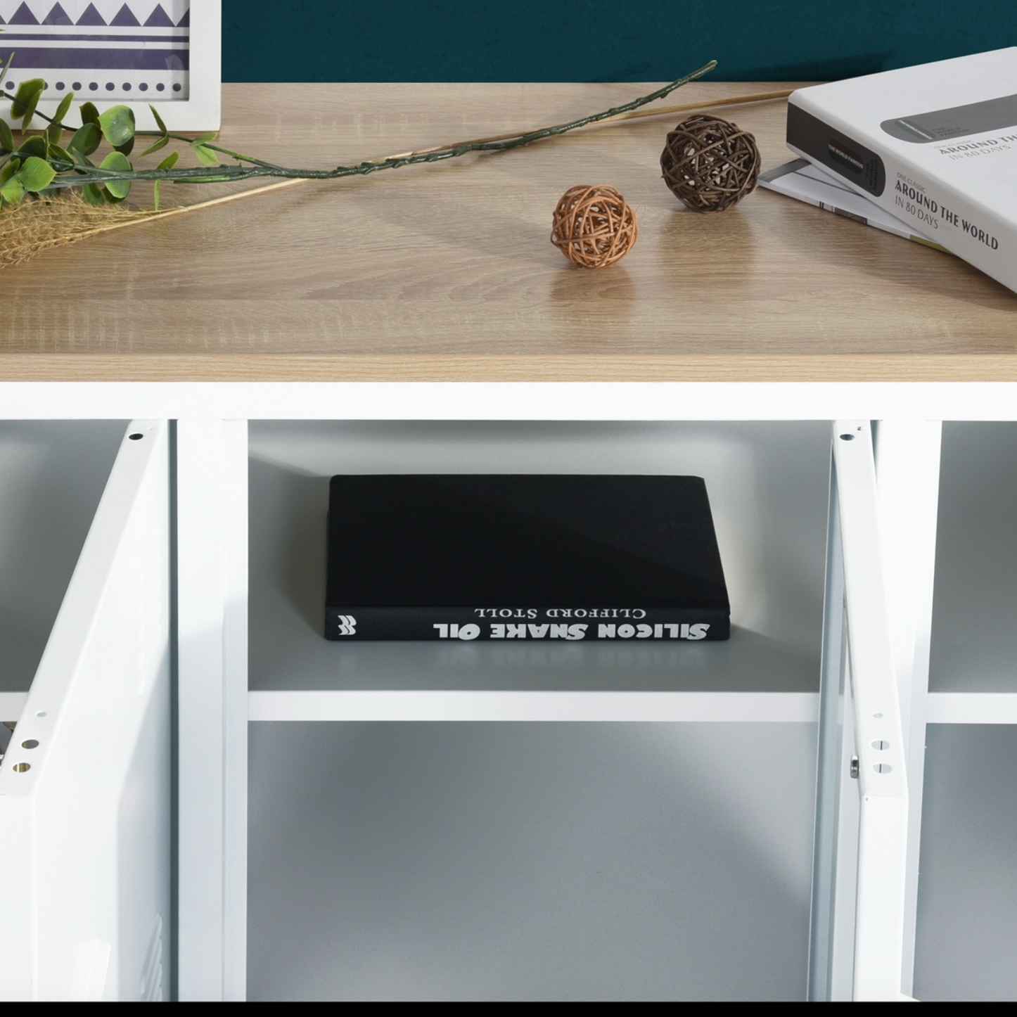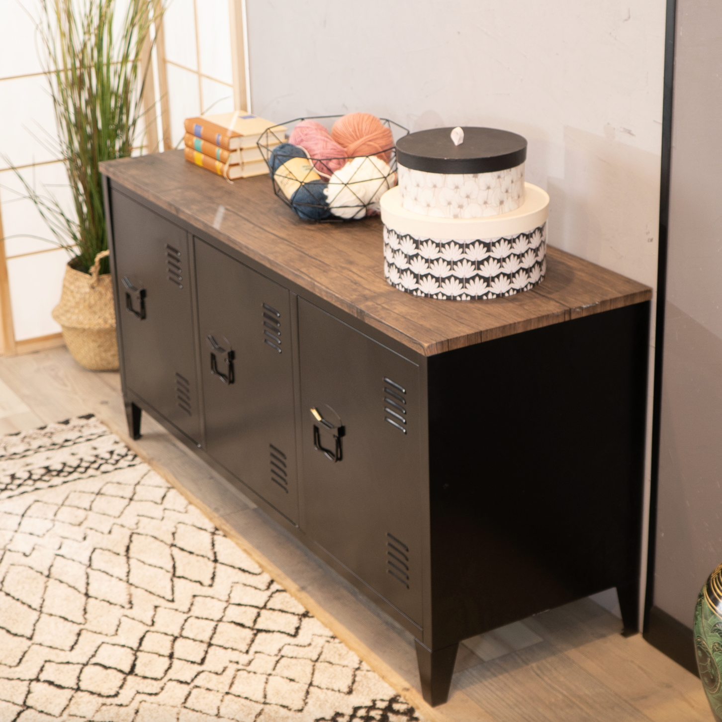 This freestanding sideboard has a modern, all-metal design that makes it ideal for adventurous interiors. Not afraid to make a style statement, it sits on four short legs and features three cabinet doors. Behind each door, a shelf offers plenty of space to store and organize home essentials.