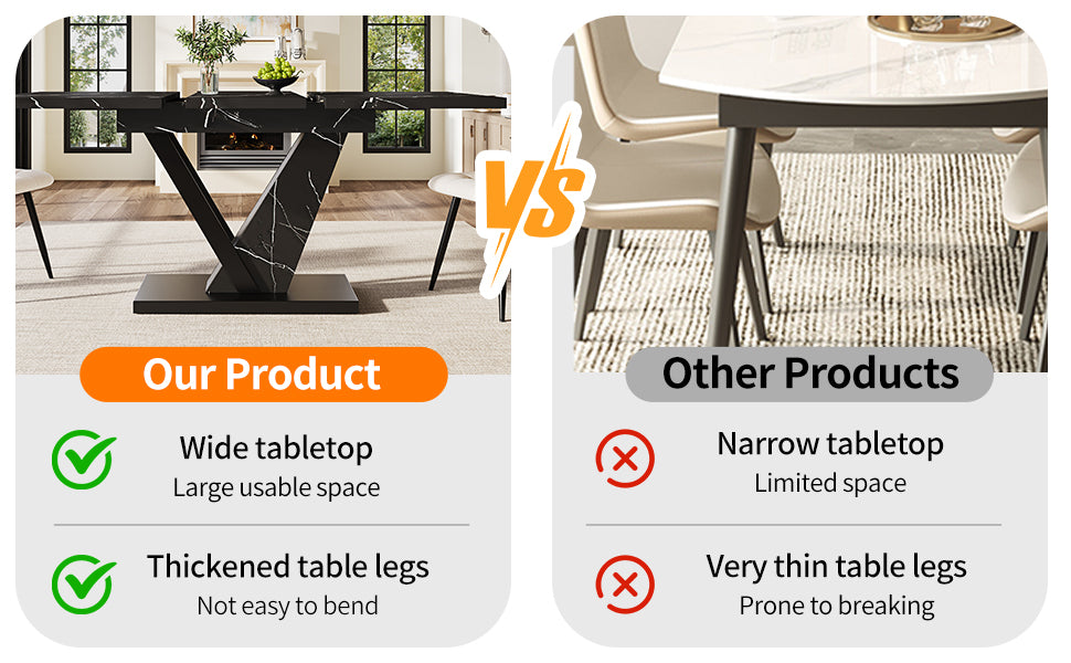 • Matériaux de Qualité Supérieure et Fabrication Robuste : Le plateau en MDF avec placage effet marbre de haute qualité est combiné à des pieds renforcés en tube de fer, garantissant une esthétique élégante, une grande durabilité et une capacité de charge exceptionnelle.