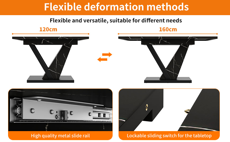 • Design Extensible Intelligent : La table s'étend de 120 cm à 160 cm grâce à des rails métalliques de précision avec interrupteur de verrouillage, permettant une transition fluide et sans effort pour s'adapter à vos besoins d'espace.