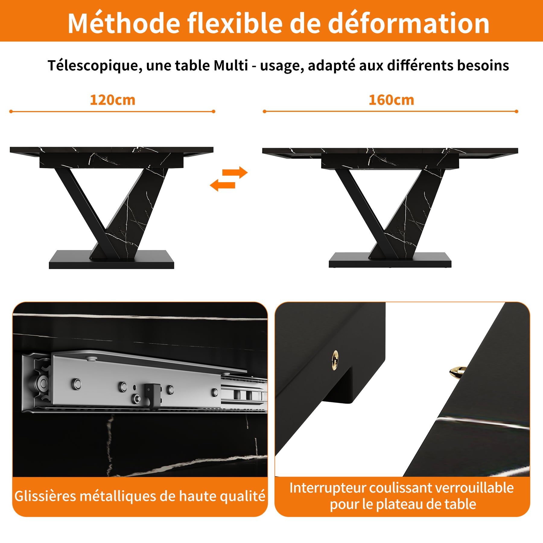 Optimisez votre espace avec cette table de salle à manger extensible au design moderne et sophistiqué, idéale pour les intérieurs contemporains. Mesurant 120 cm de long, 75 cm de large et 75,5 cm de haut, son plateau en MDF de haute qualité est orné d'un élégant placage effet marbre. Grâce à un mécanisme télescopique intelligent sur rails métalliques de précision (avec interrupteur de verrouillage), elle s'étend facilement jusqu'à 160 cm, offrant la flexibilité nécessaire pour accueillir confortablement 4 à 6 personnes. Contrairement aux tables standards, ses pieds épaissis en tube de fer et sa structure de support inférieure renforcée garantissent une stabilité et une durabilité exceptionnelles, même en cas d'utilisation quotidienne fréquente. Sa surface de travail extra-large facilite la préparation des repas et le travail à domicile, tout en restant compacte lorsqu'elle est rétractée.