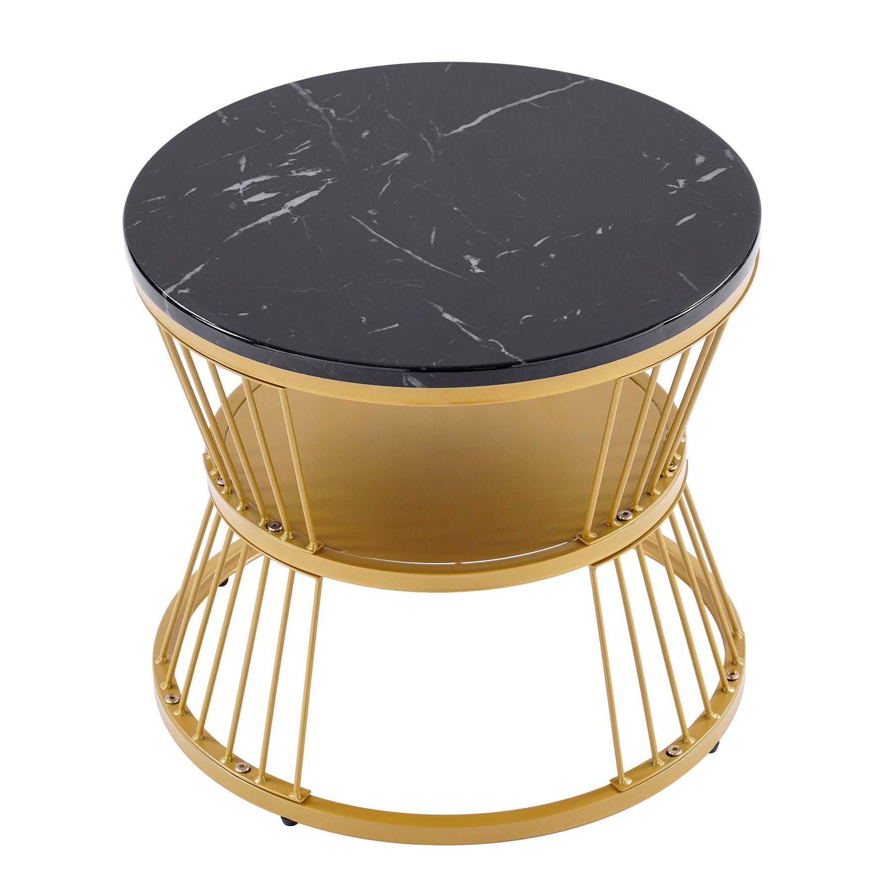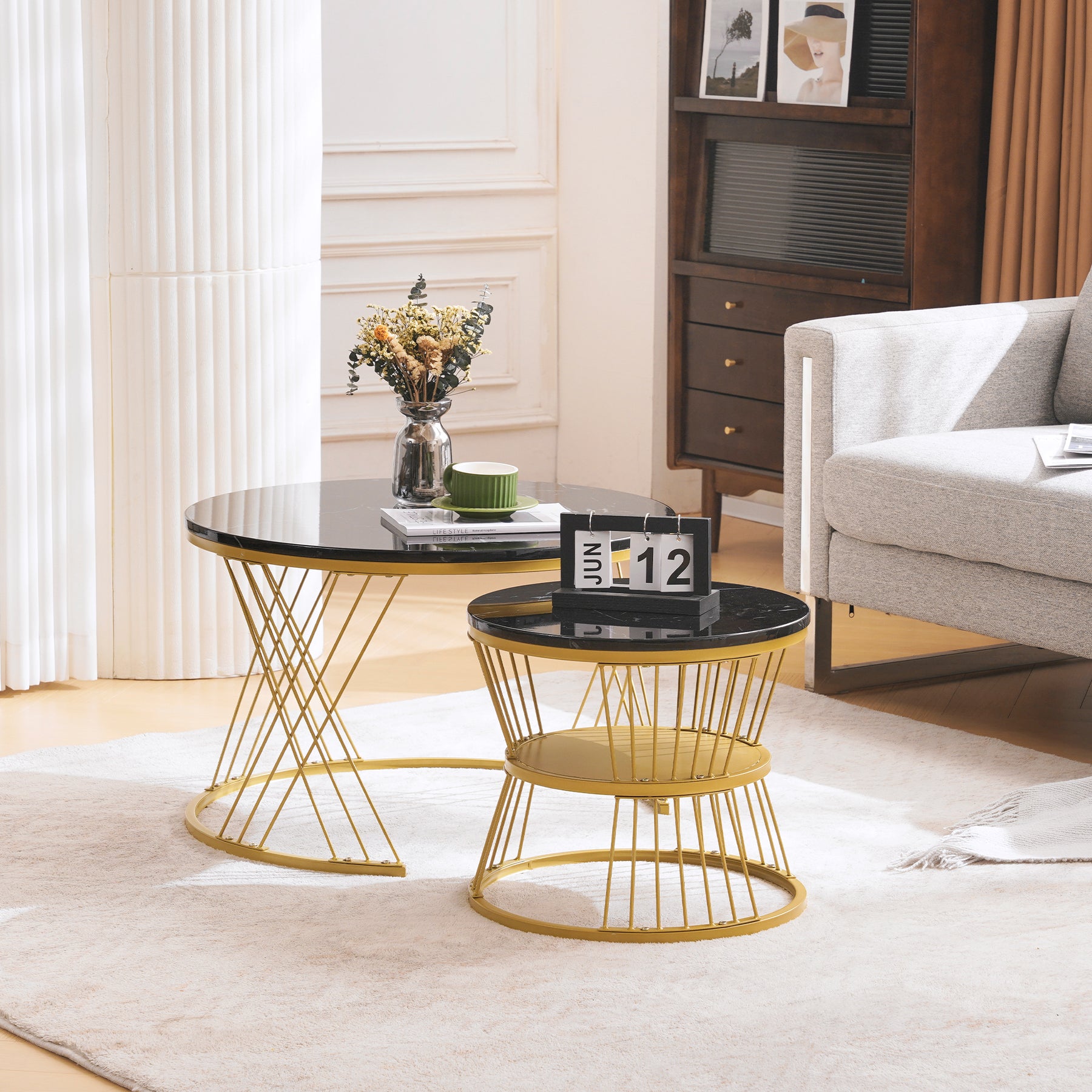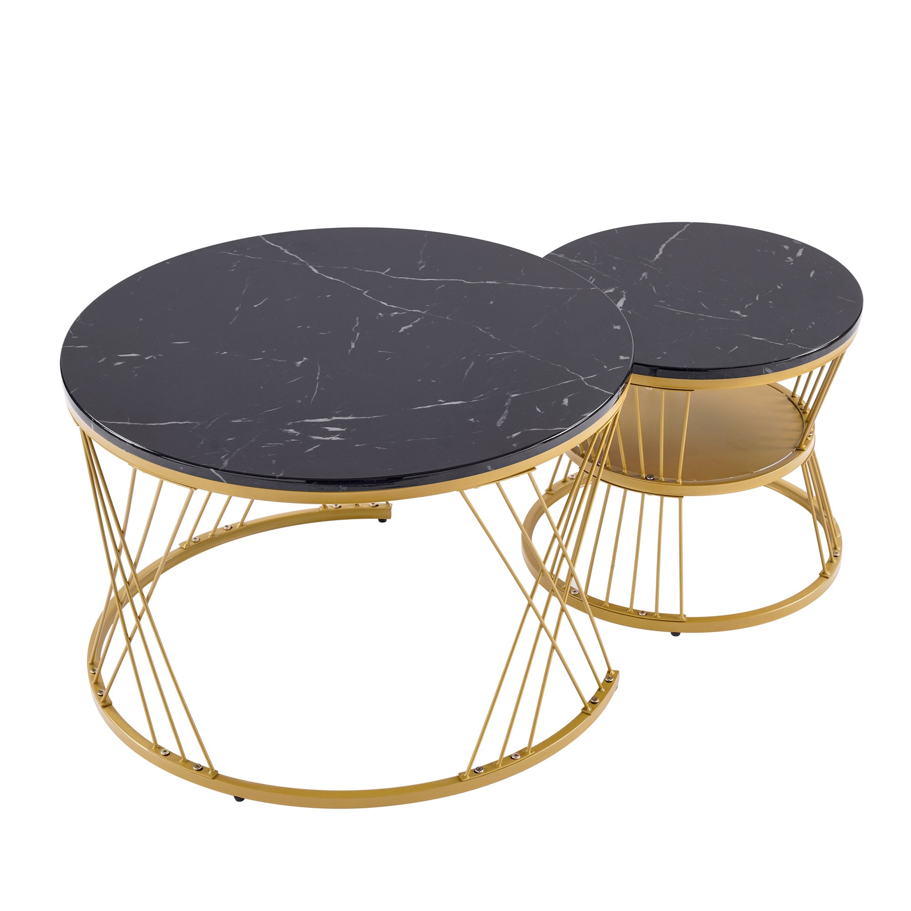 Ensemble de 2 Tables Basses Gigognes Rondes - Plateau Effet Marbre Noir et Pieds Dorés KHED