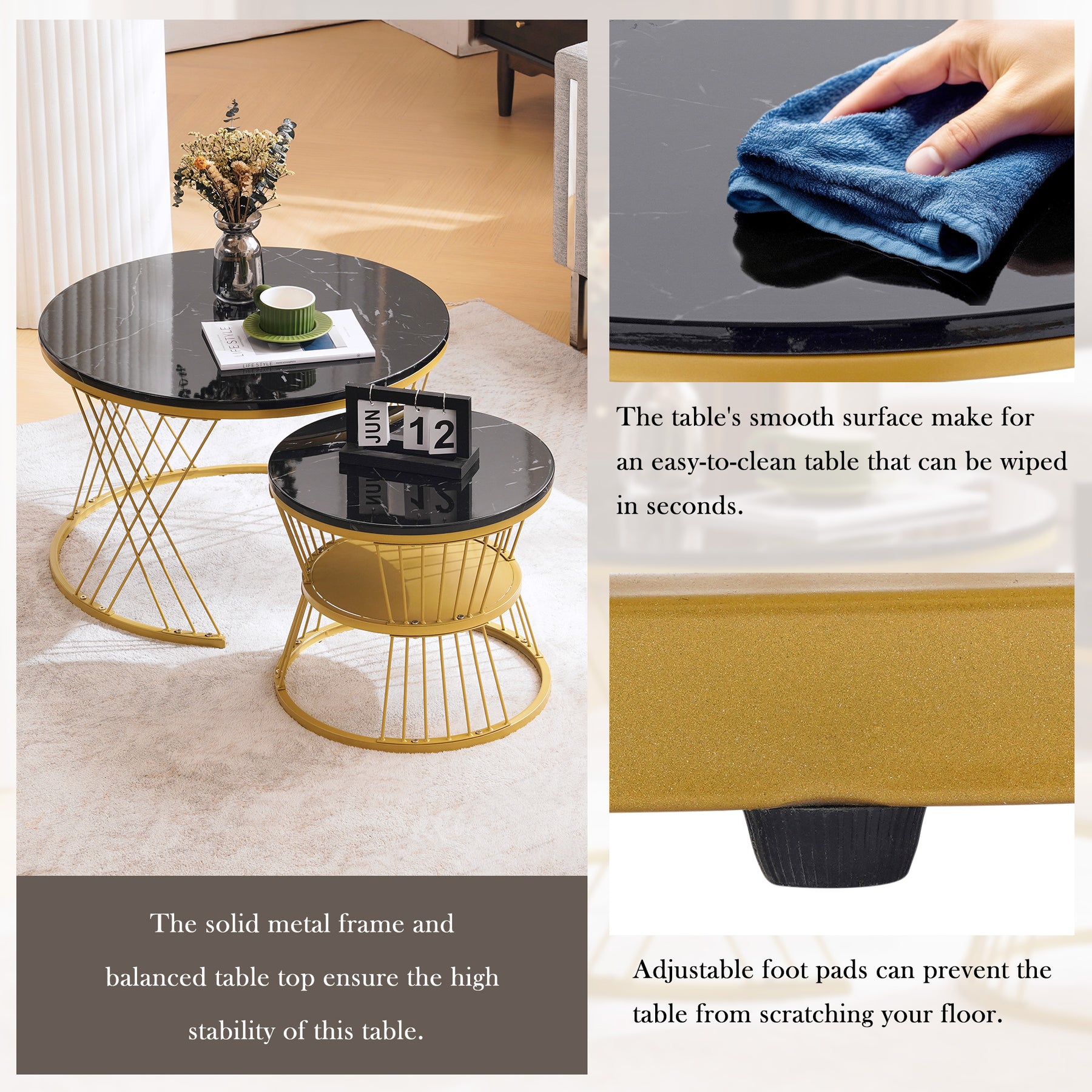 Design Moderne et Luxueux : Les plateaux en MDF avec motif effet marbre noir brillant et les élégants pieds en métal doré confèrent une esthétique luxueuse et contemporaine à votre intérieur.