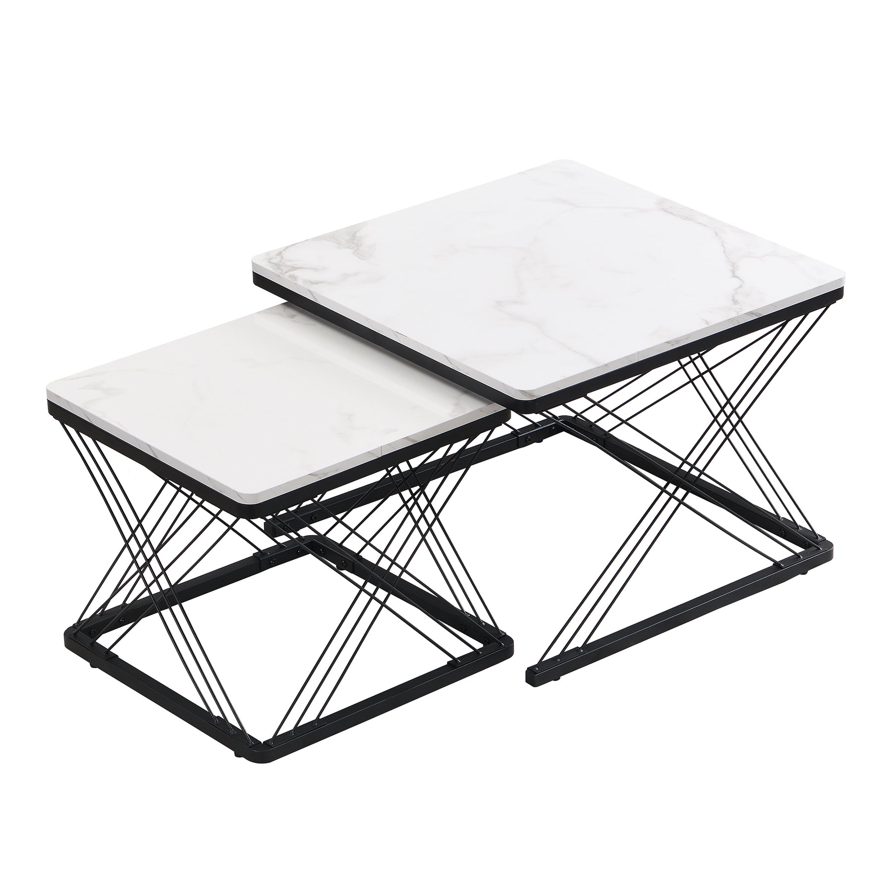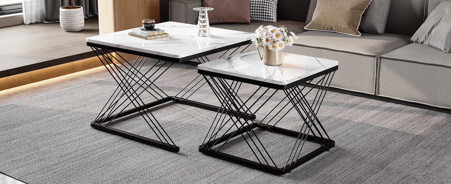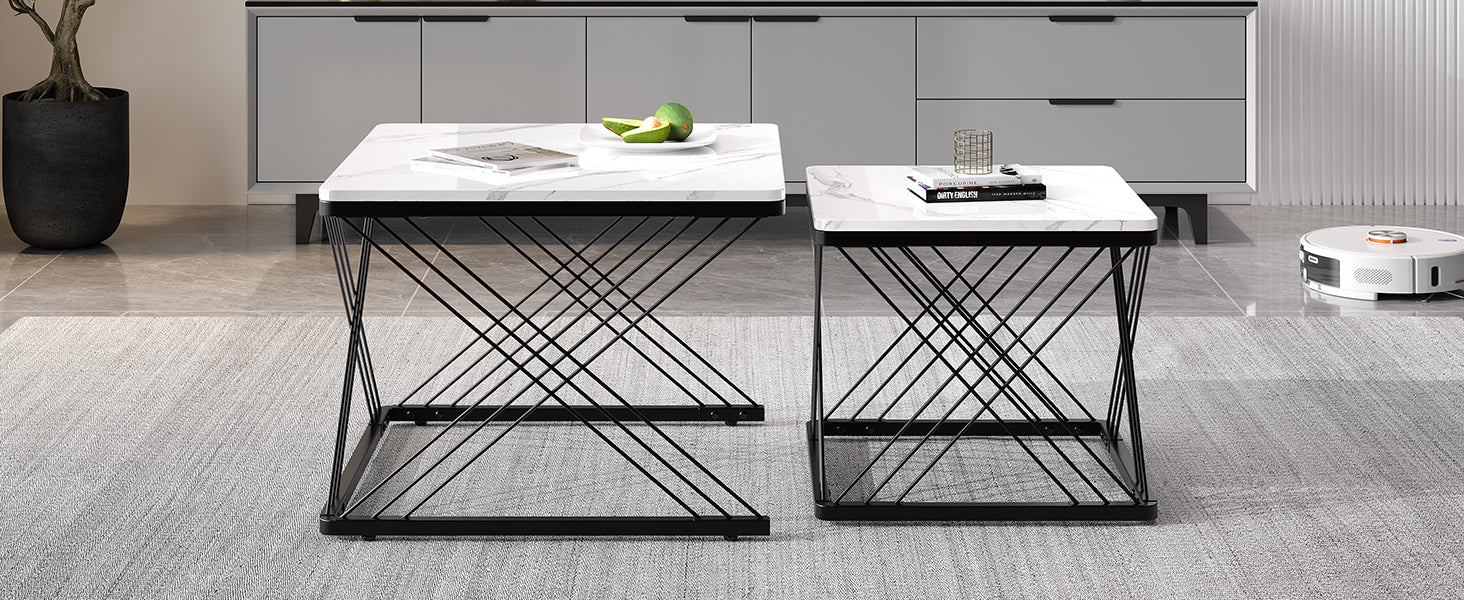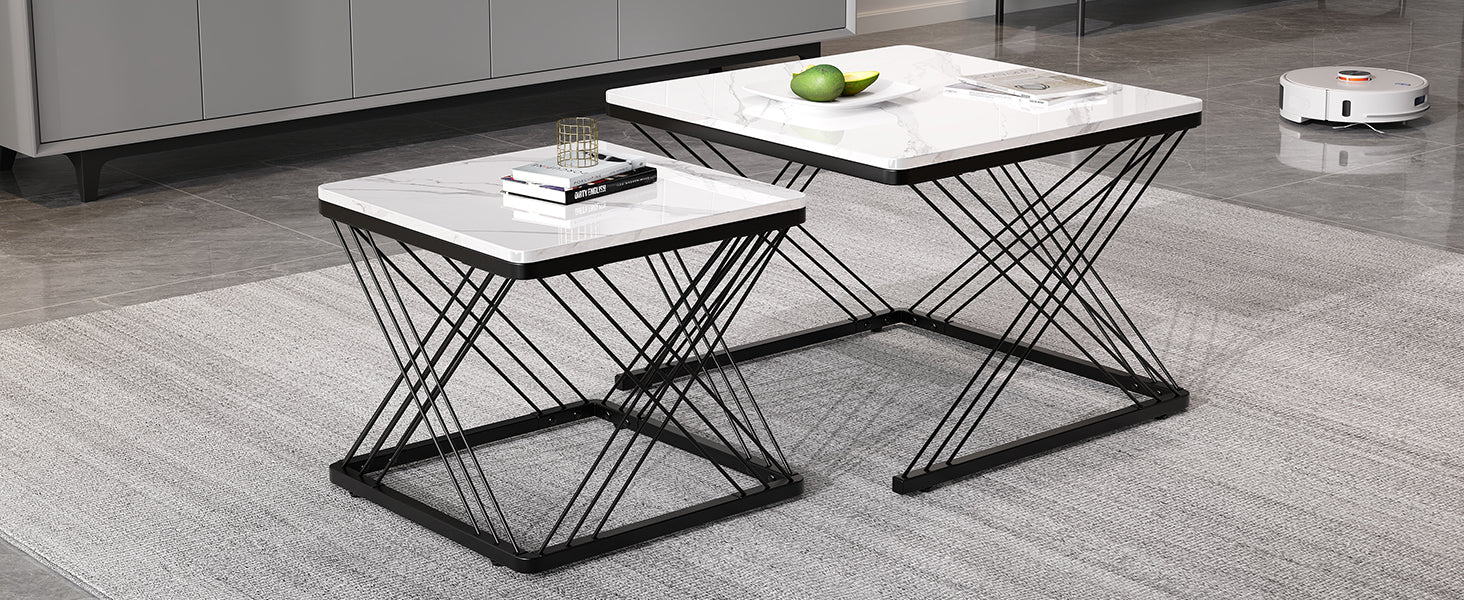 Set de 2 Tables Basses Carrées Effet Marbre Blanc et Noir - Design Moderne avec Pieds Réglables AVEDS