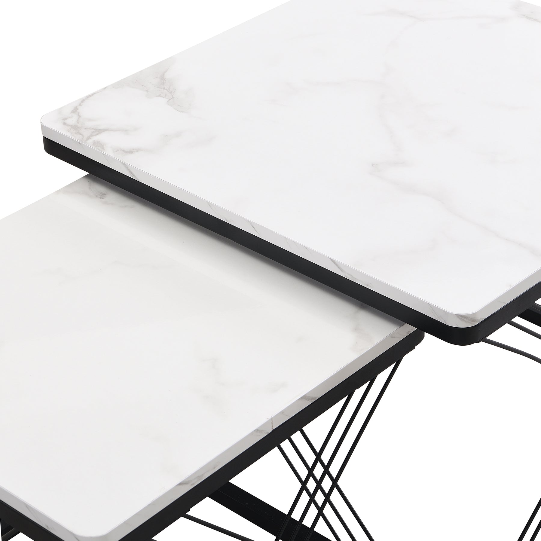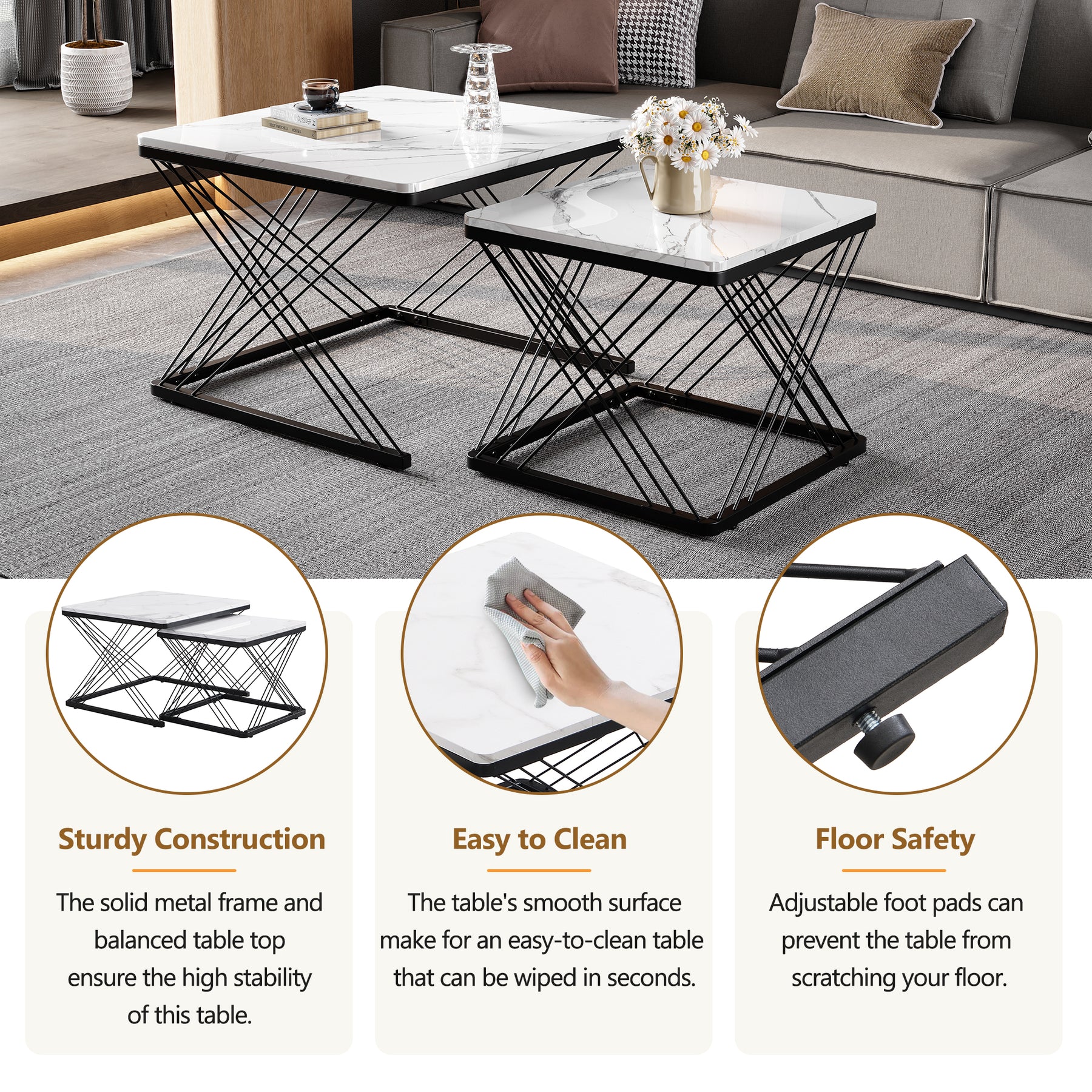 • Aspect Marbre Brillant Luxueux : Les plateaux des deux tables sont revêtus d'un élégant motif marbré très brillant, ajoutant une touche de luxe et de sophistication à n'importe quelle pièce, tout en étant facile à entretenir (note : il s'agit d'un motif, pas d'une véritable pierre de marbre).