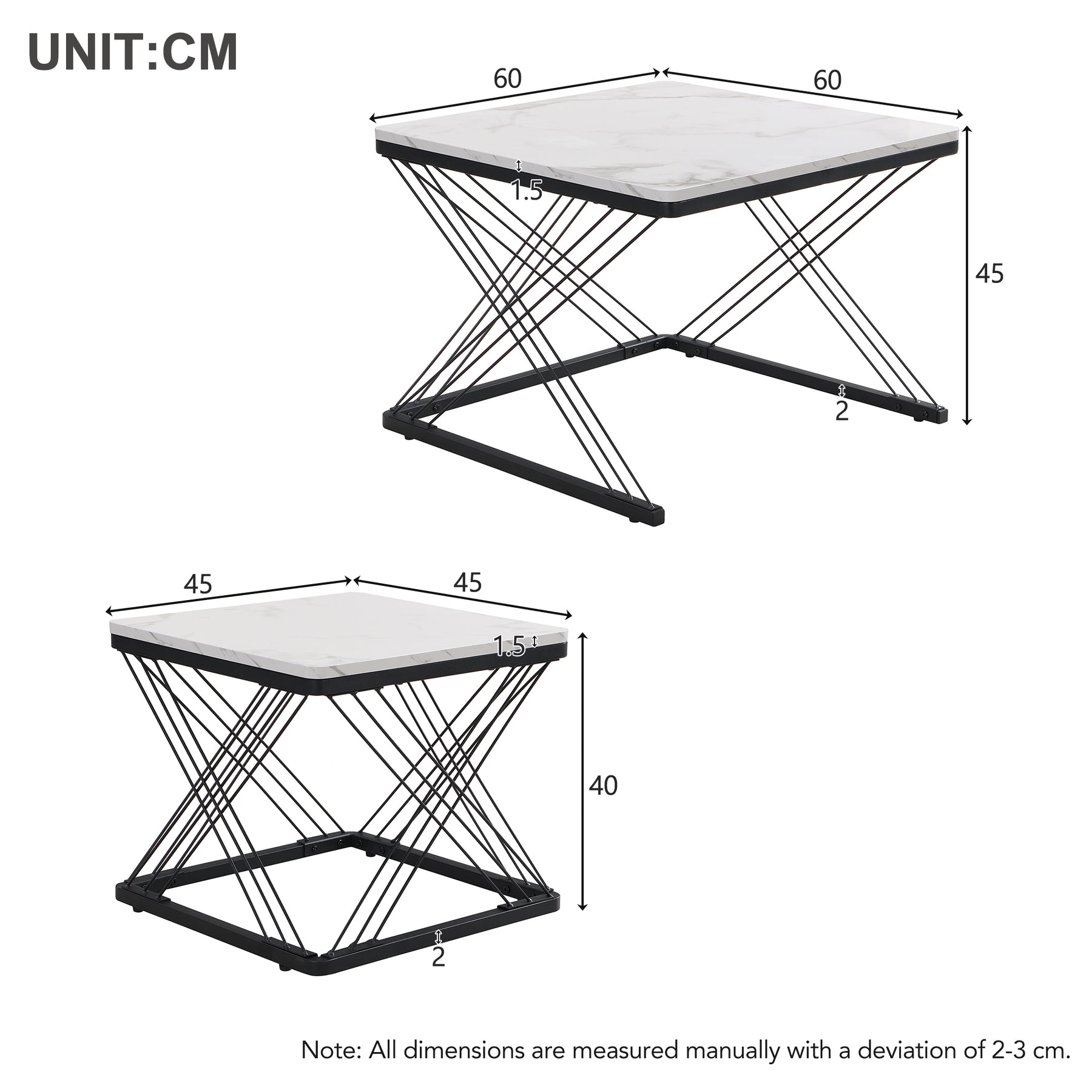 • Set de 2 Tables Flexibles : Ce set comprend deux tables basses carrées de tailles différentes (grande : 60x60x45 cm, petite : 45x45x40 cm), offrant une flexibilité maximale pour être utilisées ensemble ou séparément dans diverses configurations d'espace.