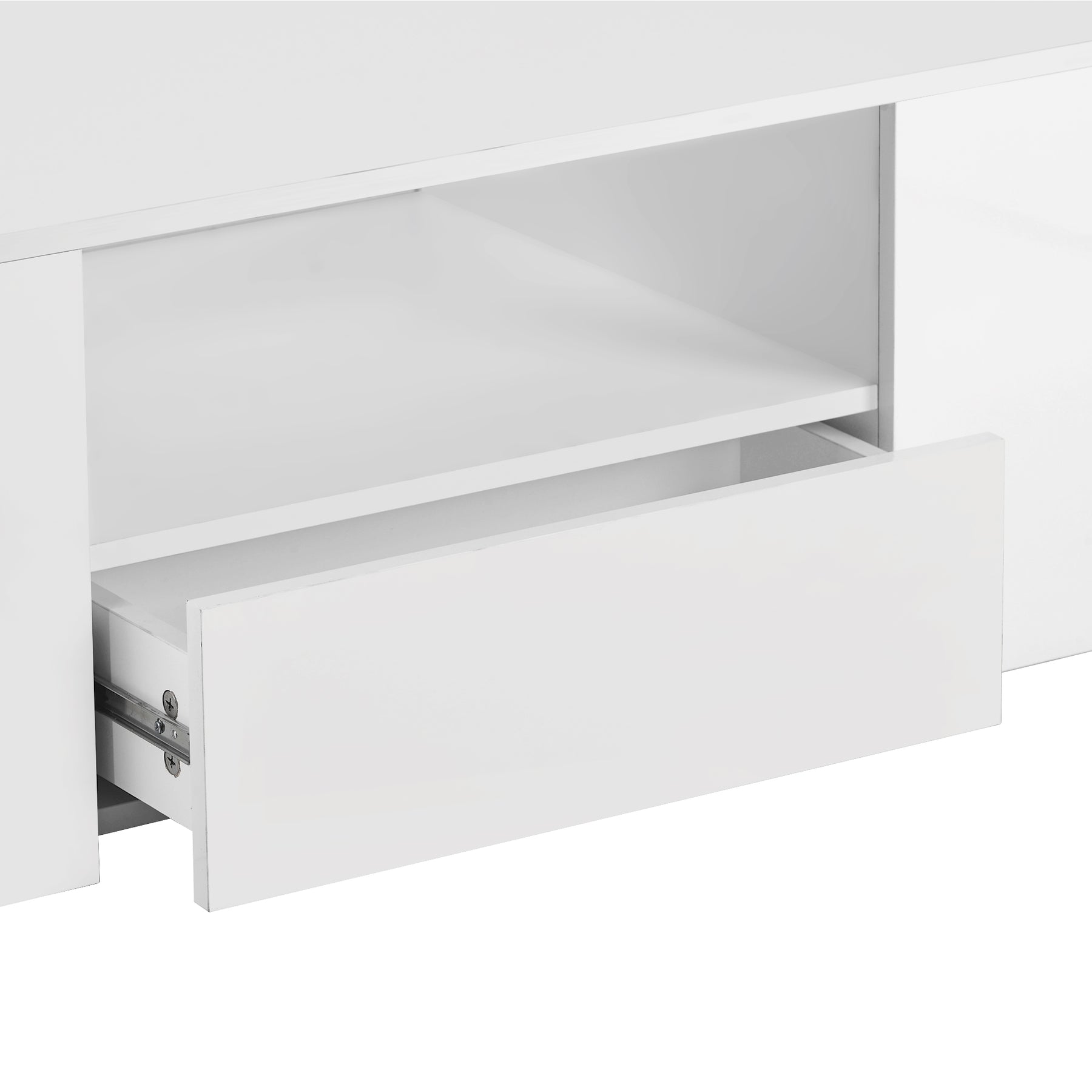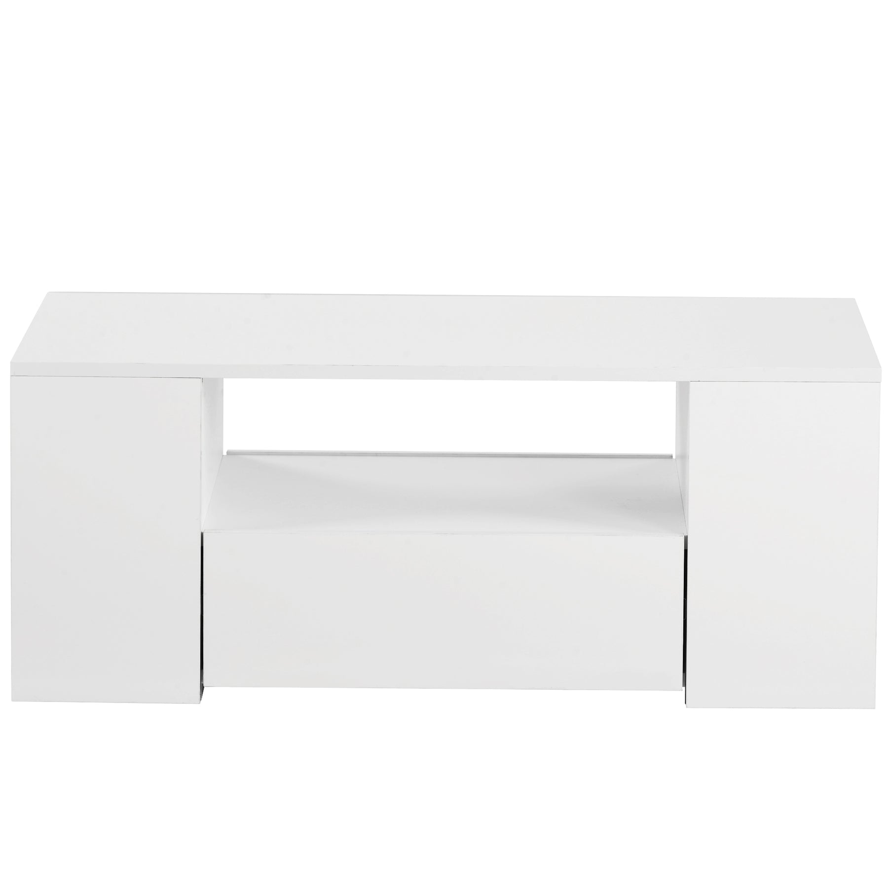 Table Basse Blanche Brillante Moderne avec 2 Tiroirs, 2 Étagères et Éclairage LED USB DUZOITH