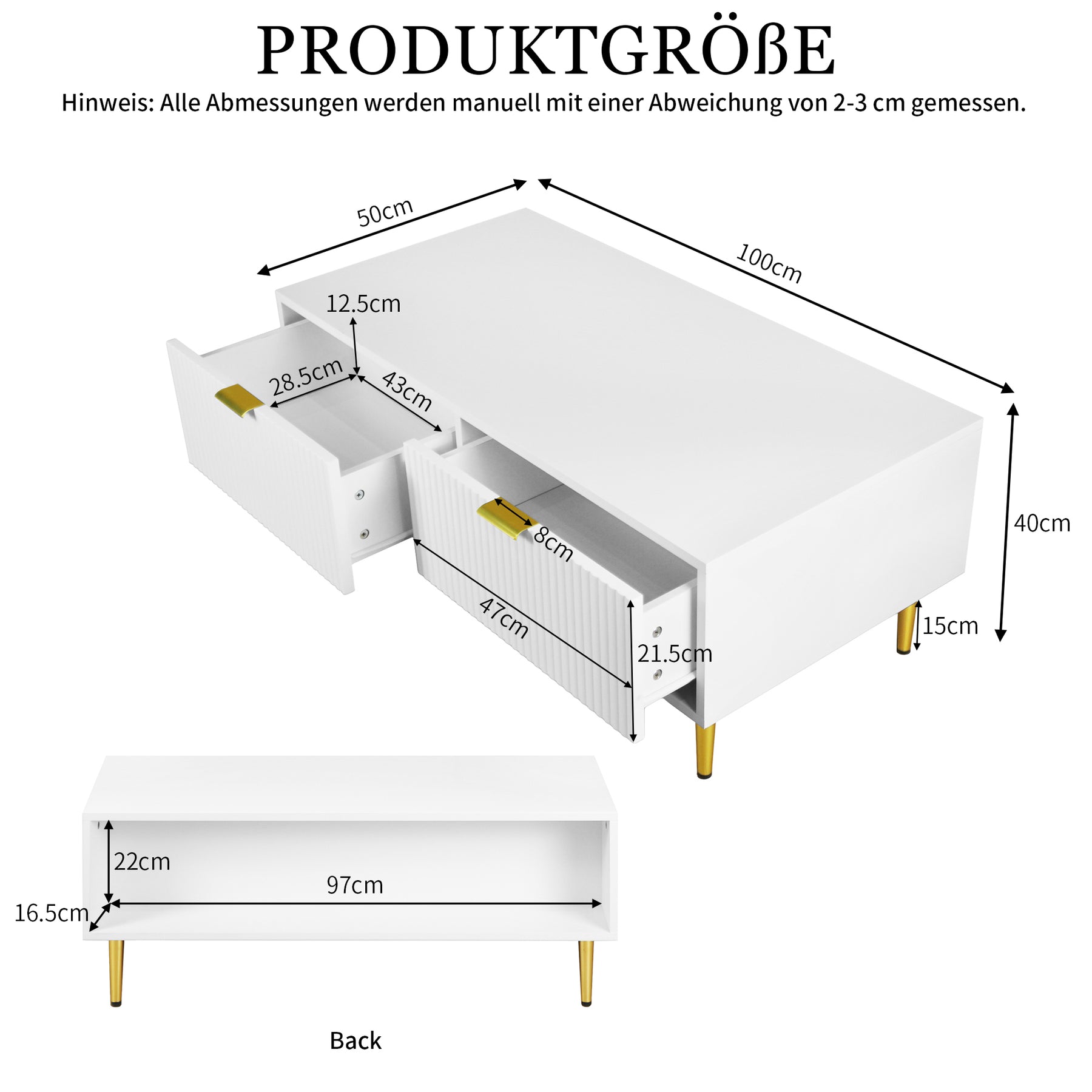 Apportez une touche d'élégance et de modernité à votre salon avec notre table basse contemporaine blanche, mesurant 100 x 50 x 40 cm. Avec ses poignées et ses pieds dorés, cette table basse n'est pas seulement un meuble fonctionnel, mais aussi un atout esthétique qui rayonne de luxe dans votre espace de vie. Elle est conçue pour impressionner vos invités et offrir un espace de rangement généreux, alliant style et praticité.