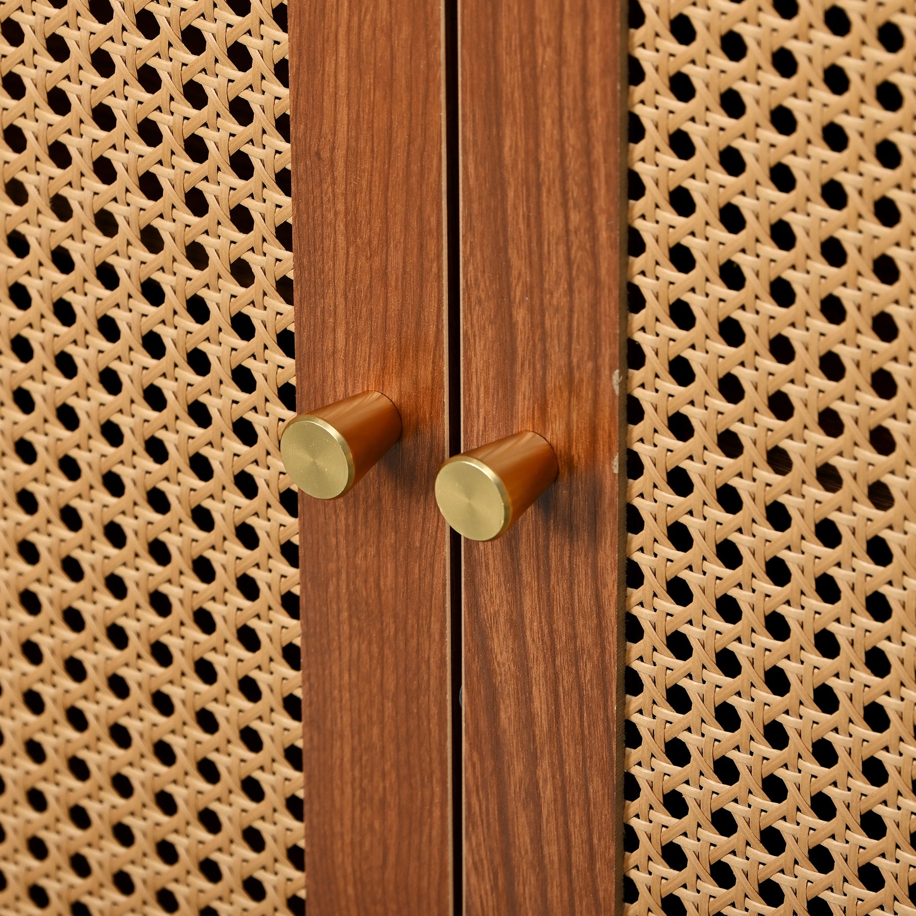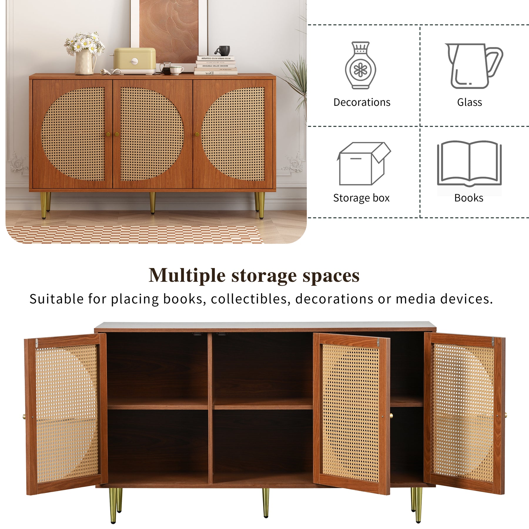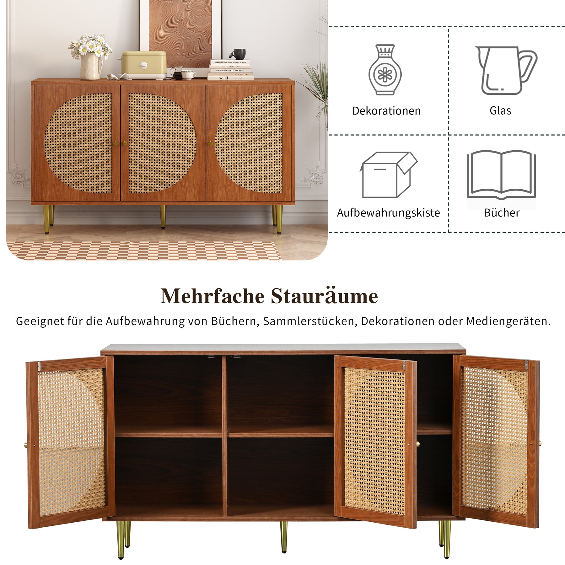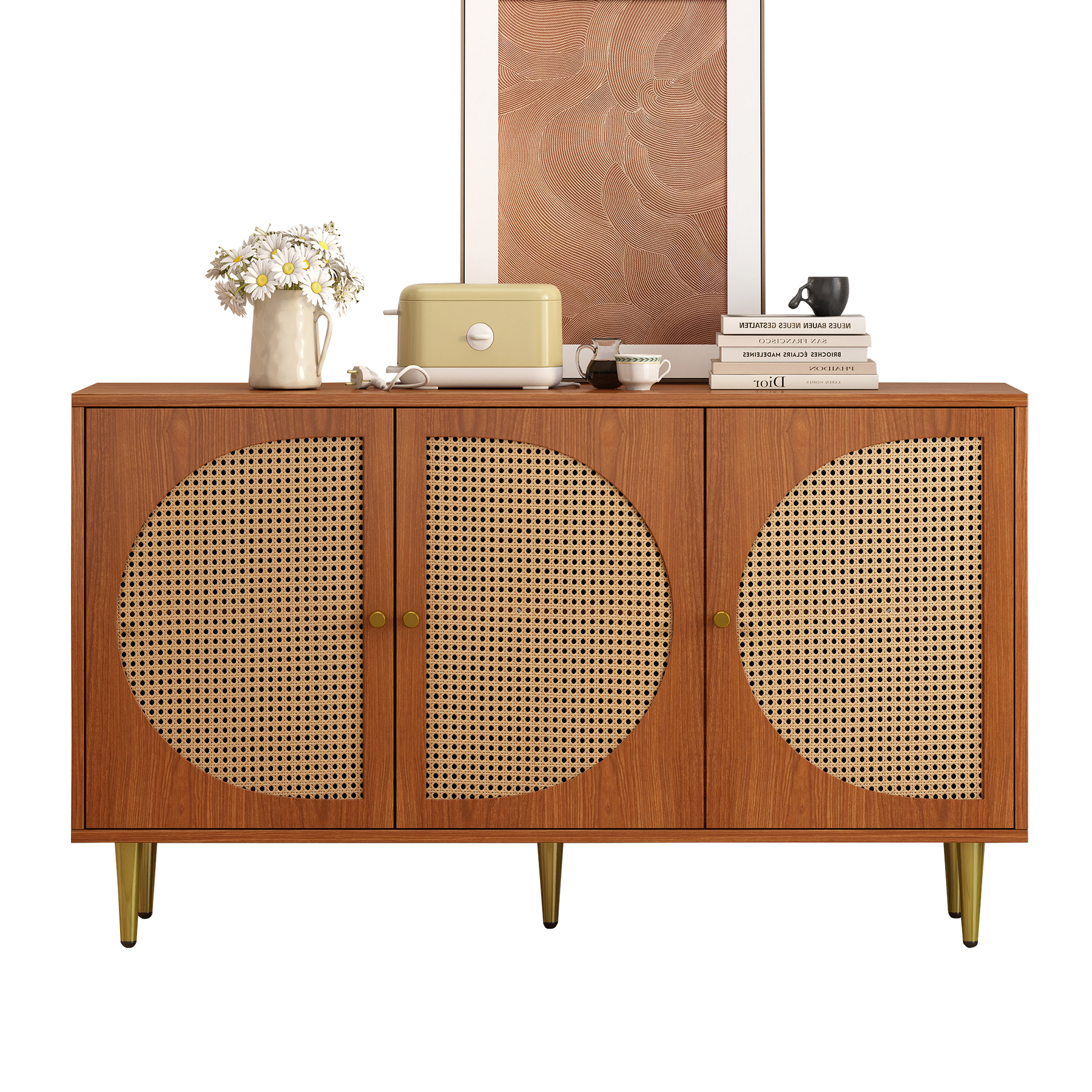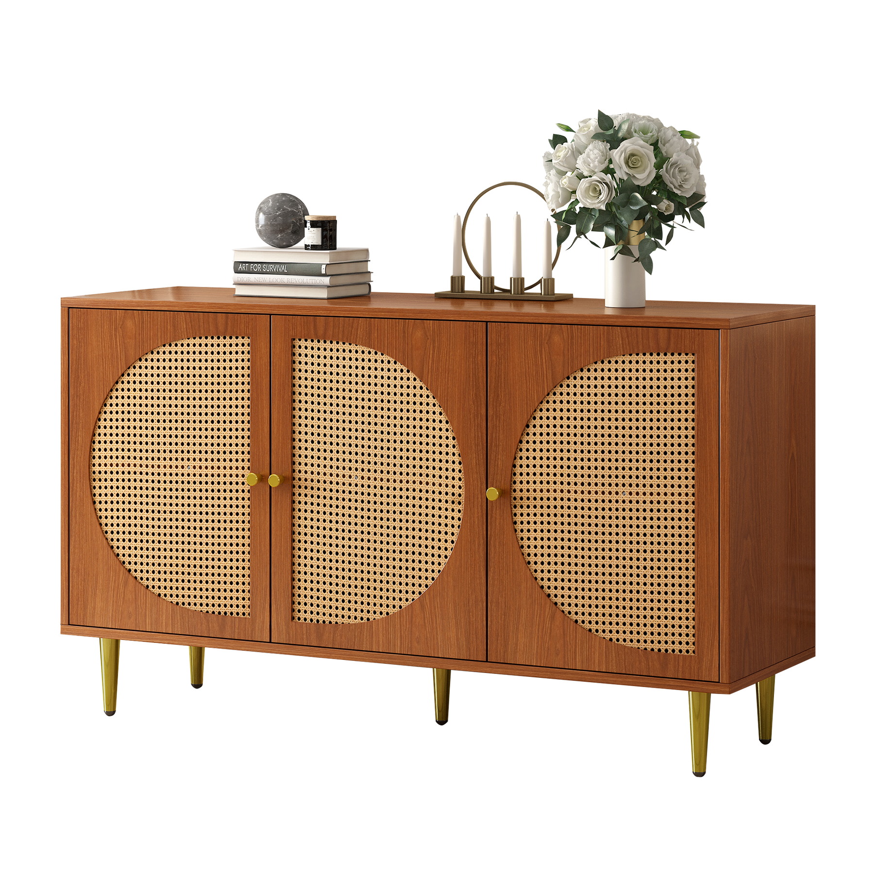 Buffet Élégant Noyer avec 3 Portes en Rotin Tressé et Pieds Métalliques OMOILL