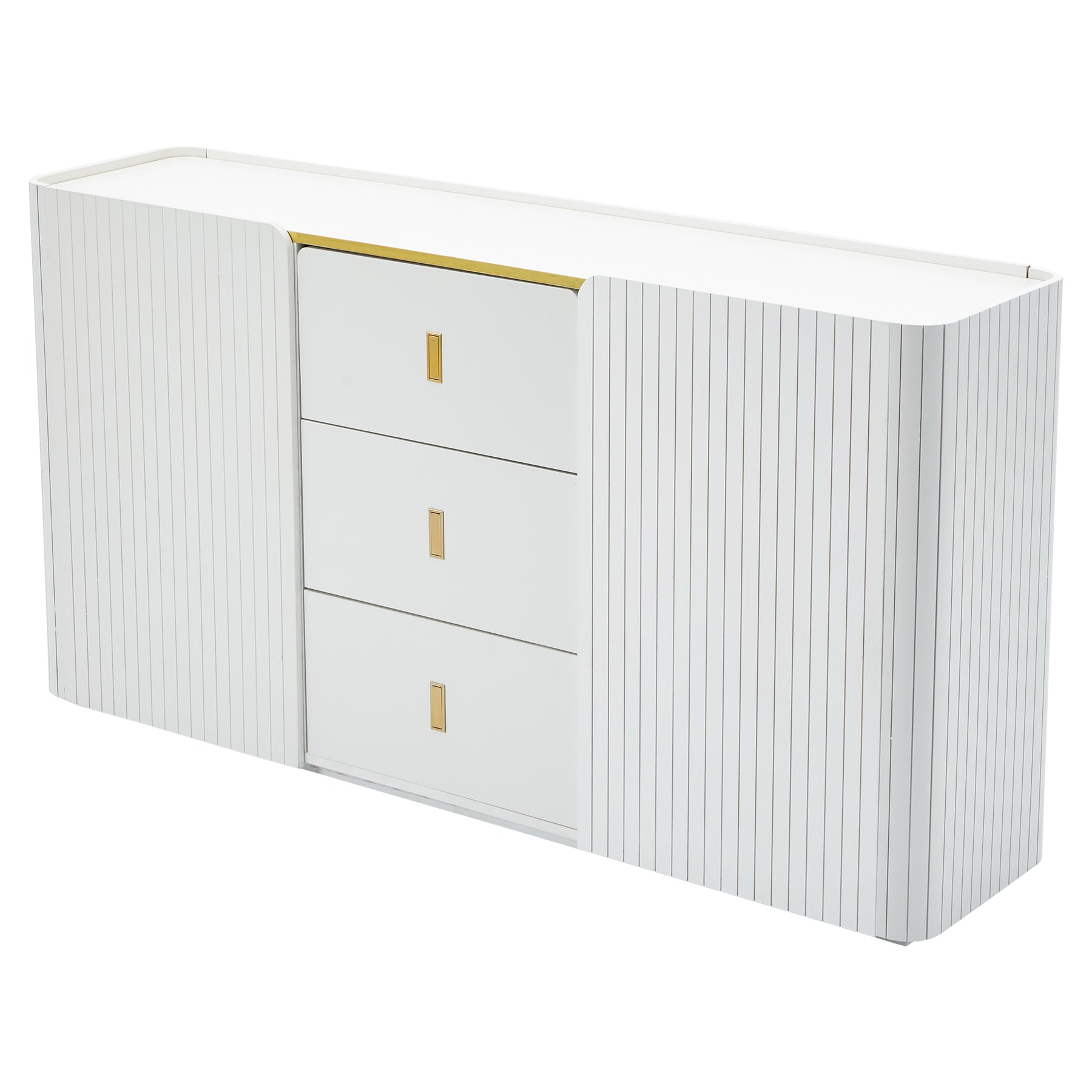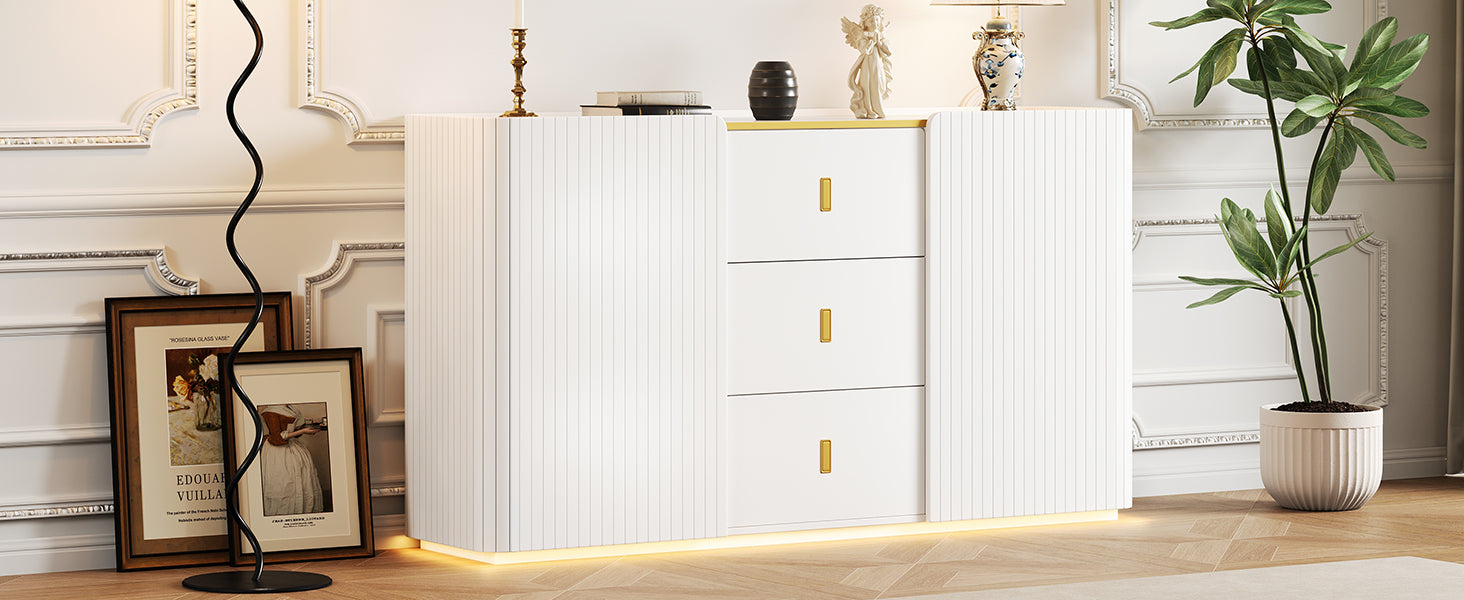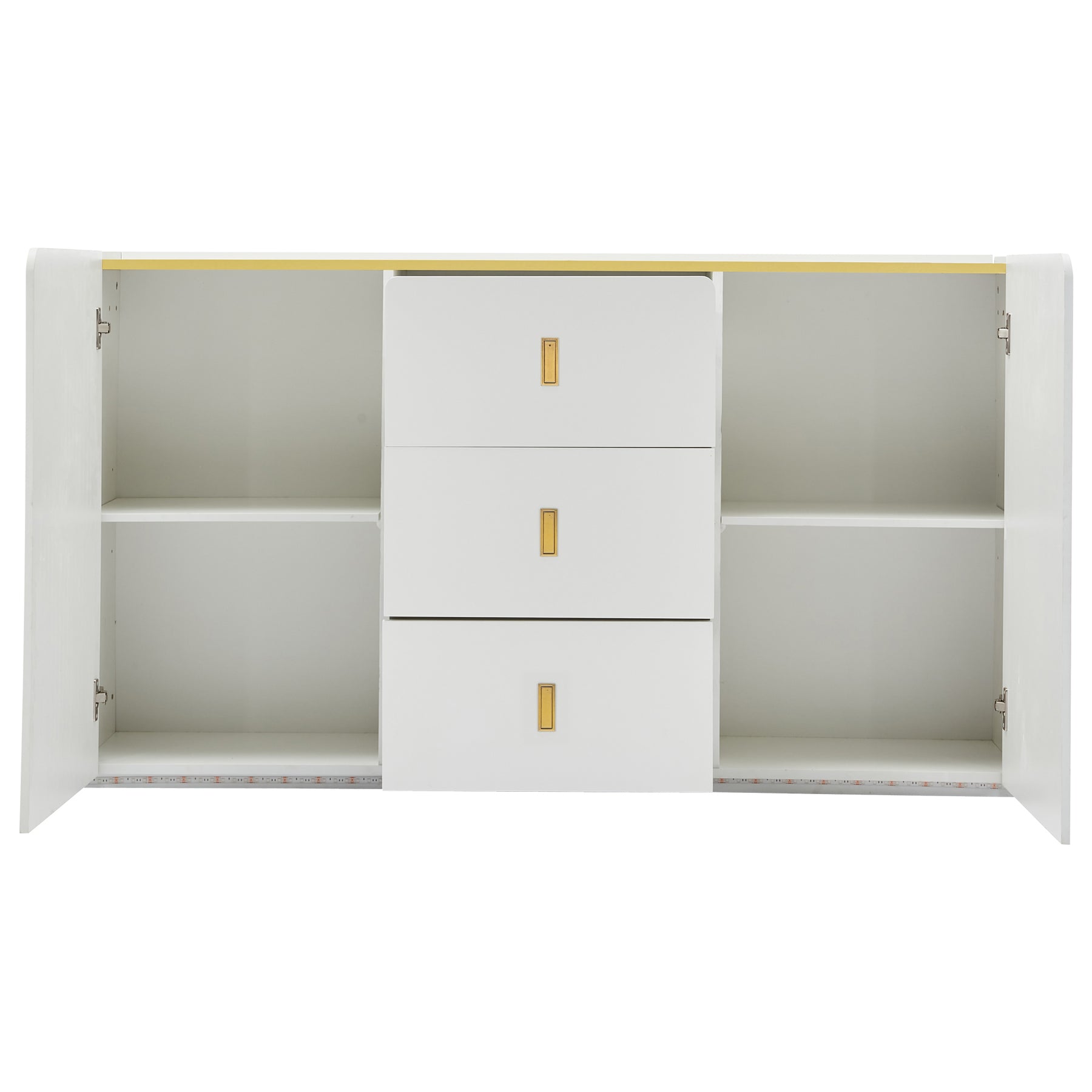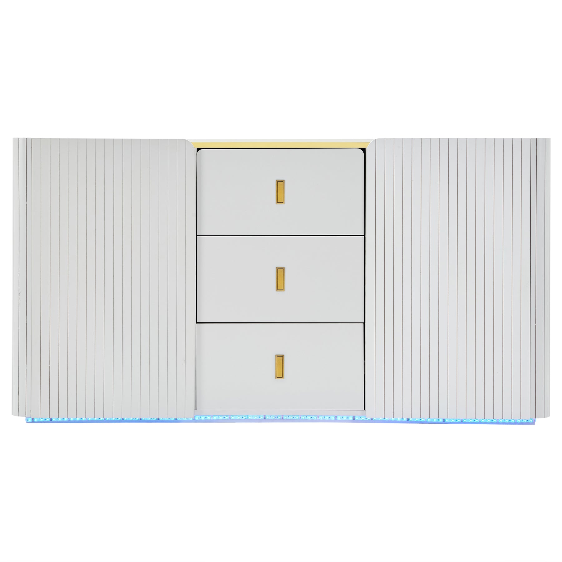 Buffet LED Multifonctionnel Blanc avec 20 Couleurs, Portes Striées et 3 Tiroirs KRAUDREL
