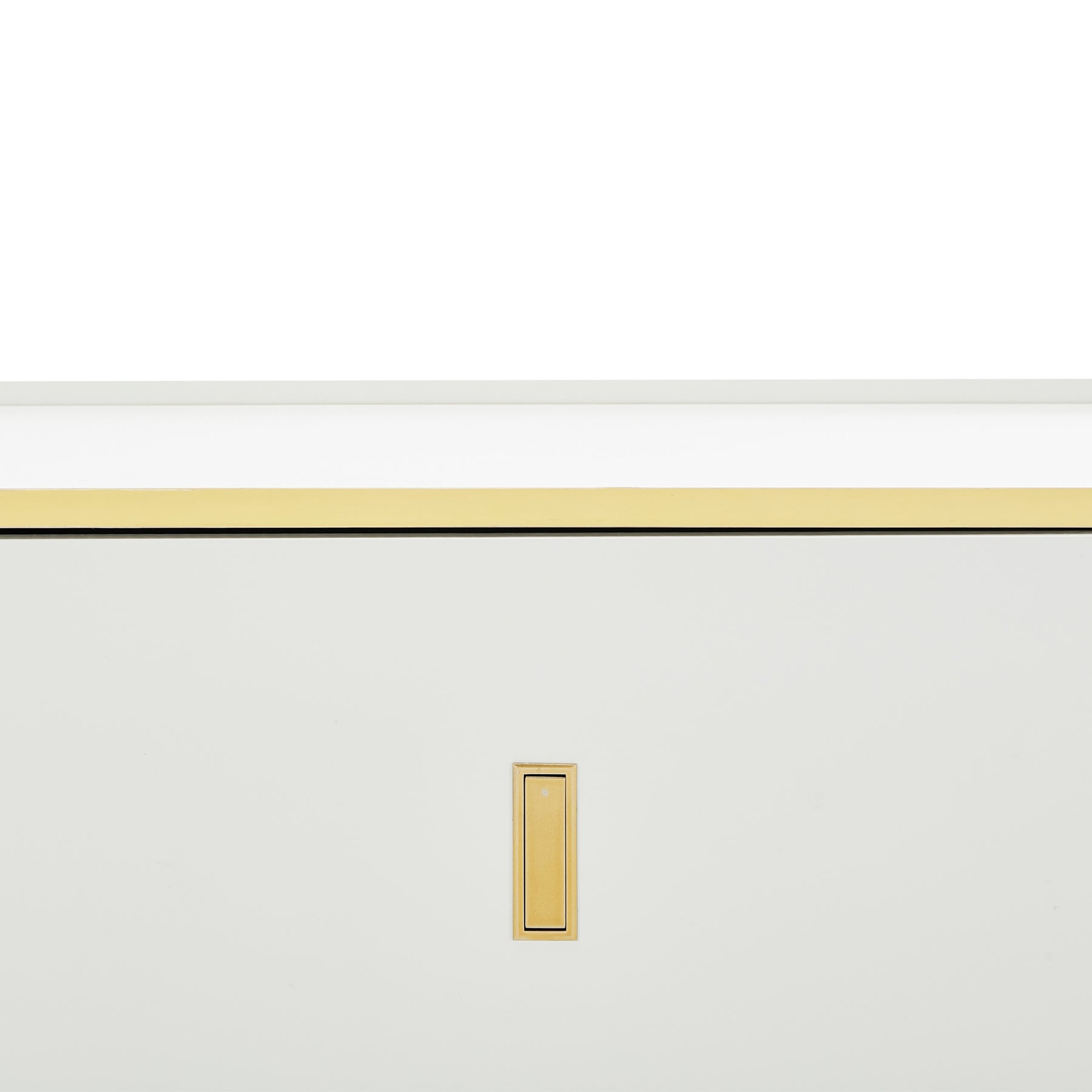 Ce buffet blanc élégant de 150 x 35 x 80 cm est conçu pour ajouter une touche de sophistication et de fonctionnalité à votre intérieur. Il est doté d'un éclairage LED intégré offrant 20 couleurs différentes, 22 réglages de luminosité et 4 modes d'éclairage, contrôlables à distance, pour créer l'ambiance parfaite. Ses deux portes sont ornées de bandes verticales exquises, lui conférant un style bohème unique, rehaussé par des poignées et des pieds dorés pour une esthétique exceptionnelle. Fabriqué en panneaux de particules de haute qualité avec une finition soignée et des renforts anti-basculement, il assure stabilité et durabilité. Avec son grand plateau, ses deux portes et trois tiroirs, il offre un espace de rangement généreux pour organiser vos affaires.