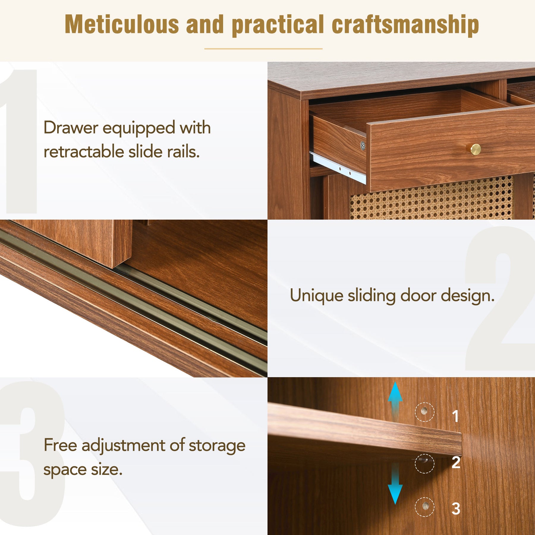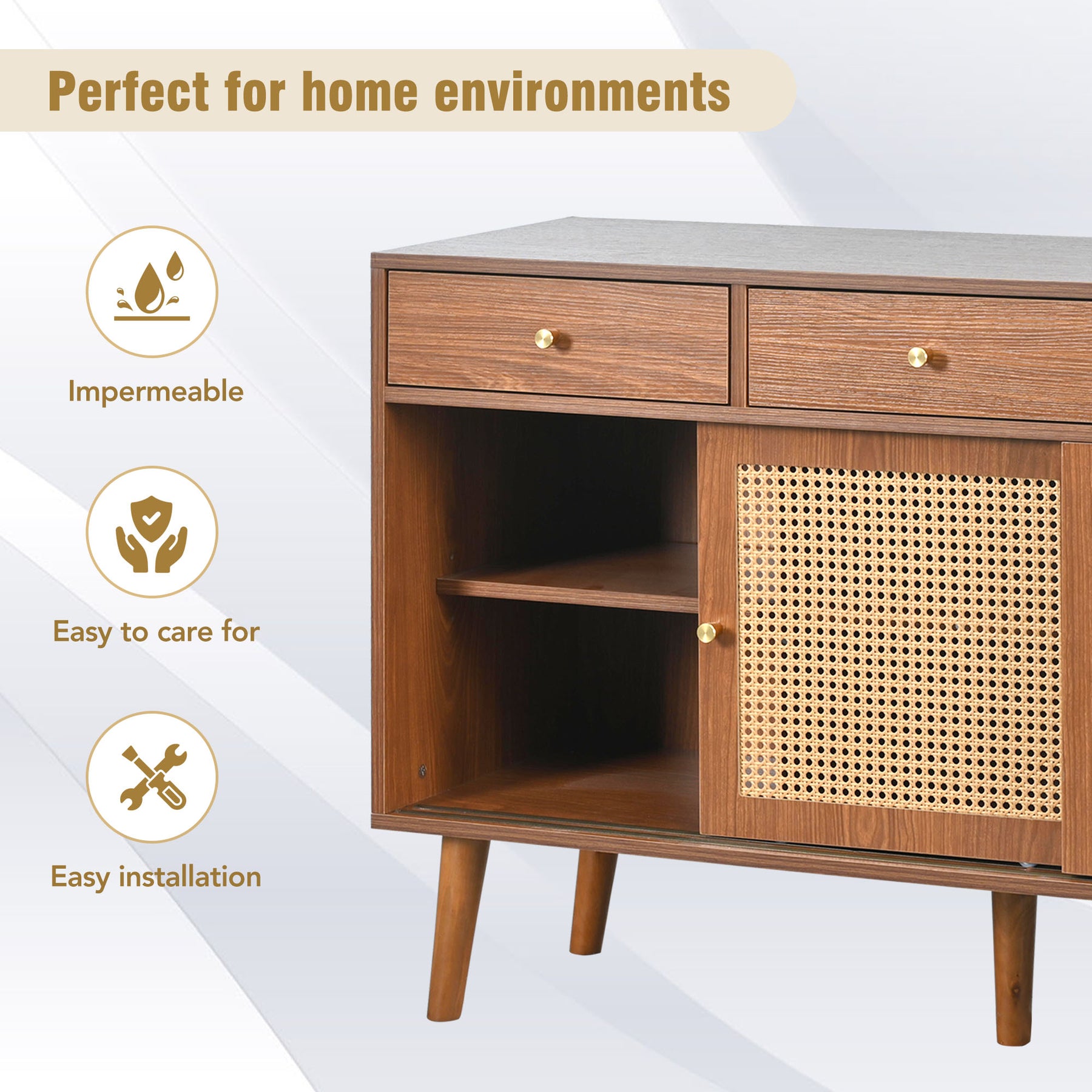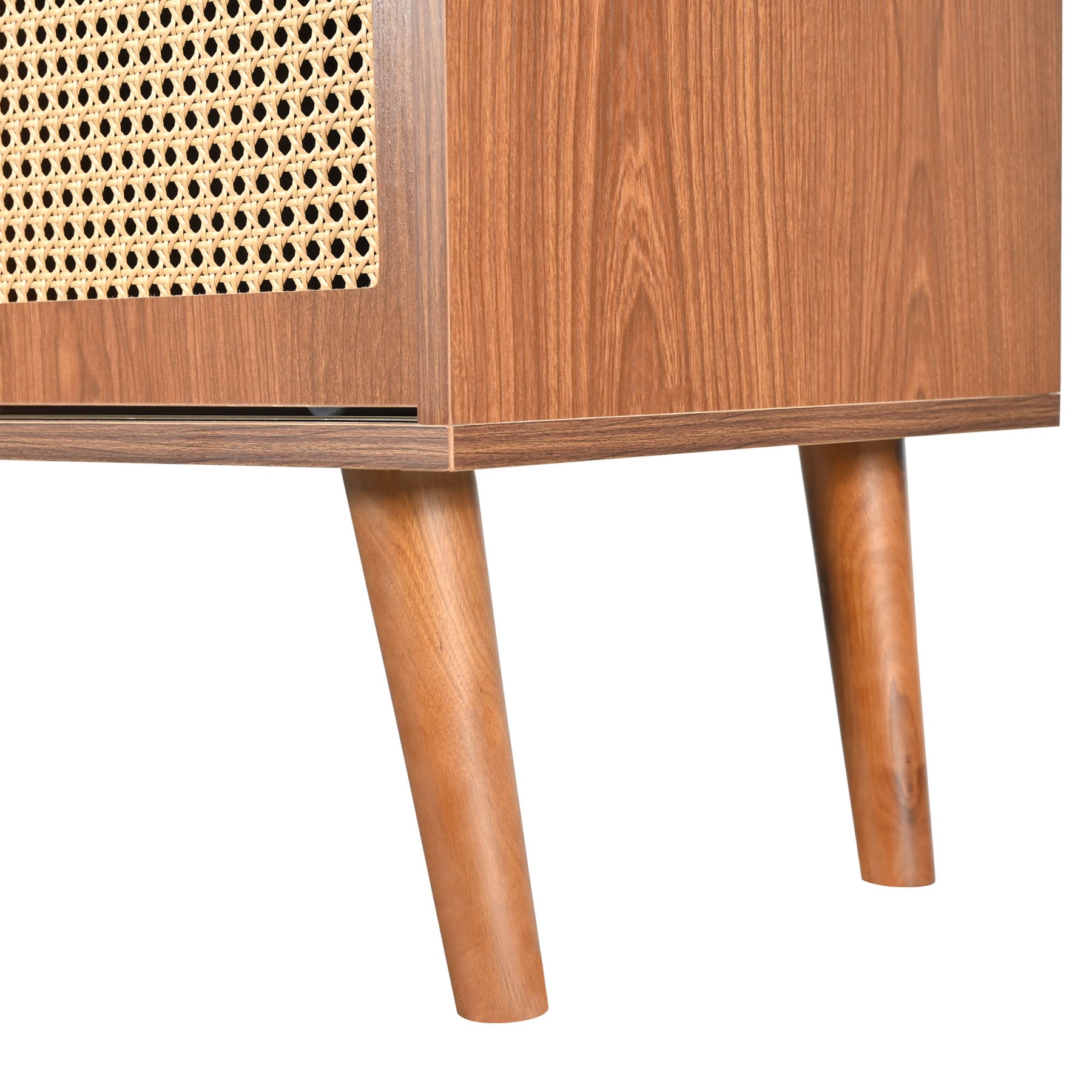 • Design Élégant et Rétro : La couleur noyer apporte de la texture et une touche vintage parfaite à la vie de la maison. Le meuble, complété par des pieds de style rotin et des poignées métalliques, unit parfaitement des éléments naturels et industriels pour un style simple et élégant.