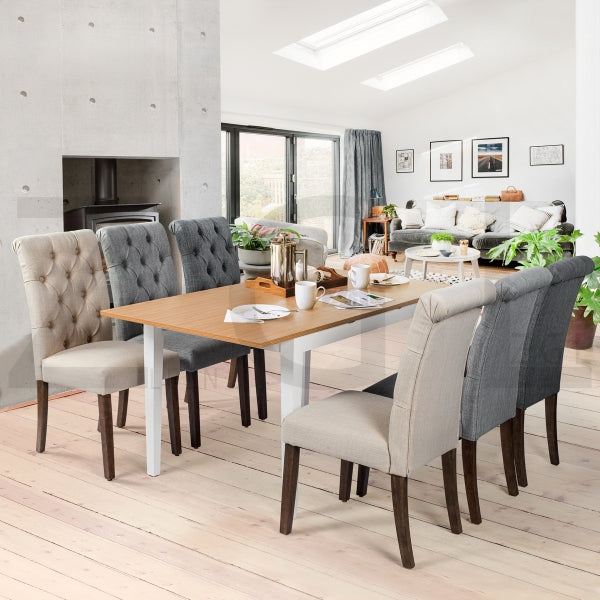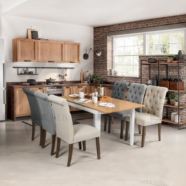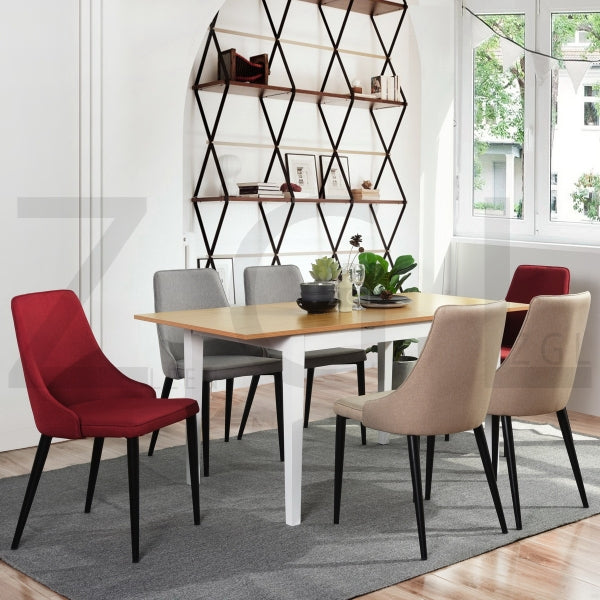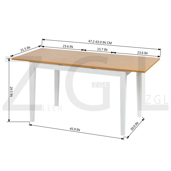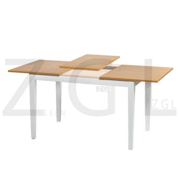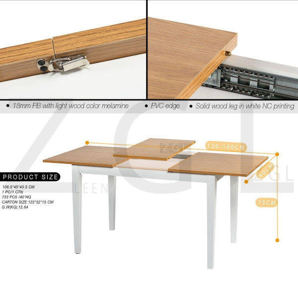 Extension round table. 18mm PB with light wood color melamine, PVC edge; solid wood leg in white NC printing. 200lbs brown box.