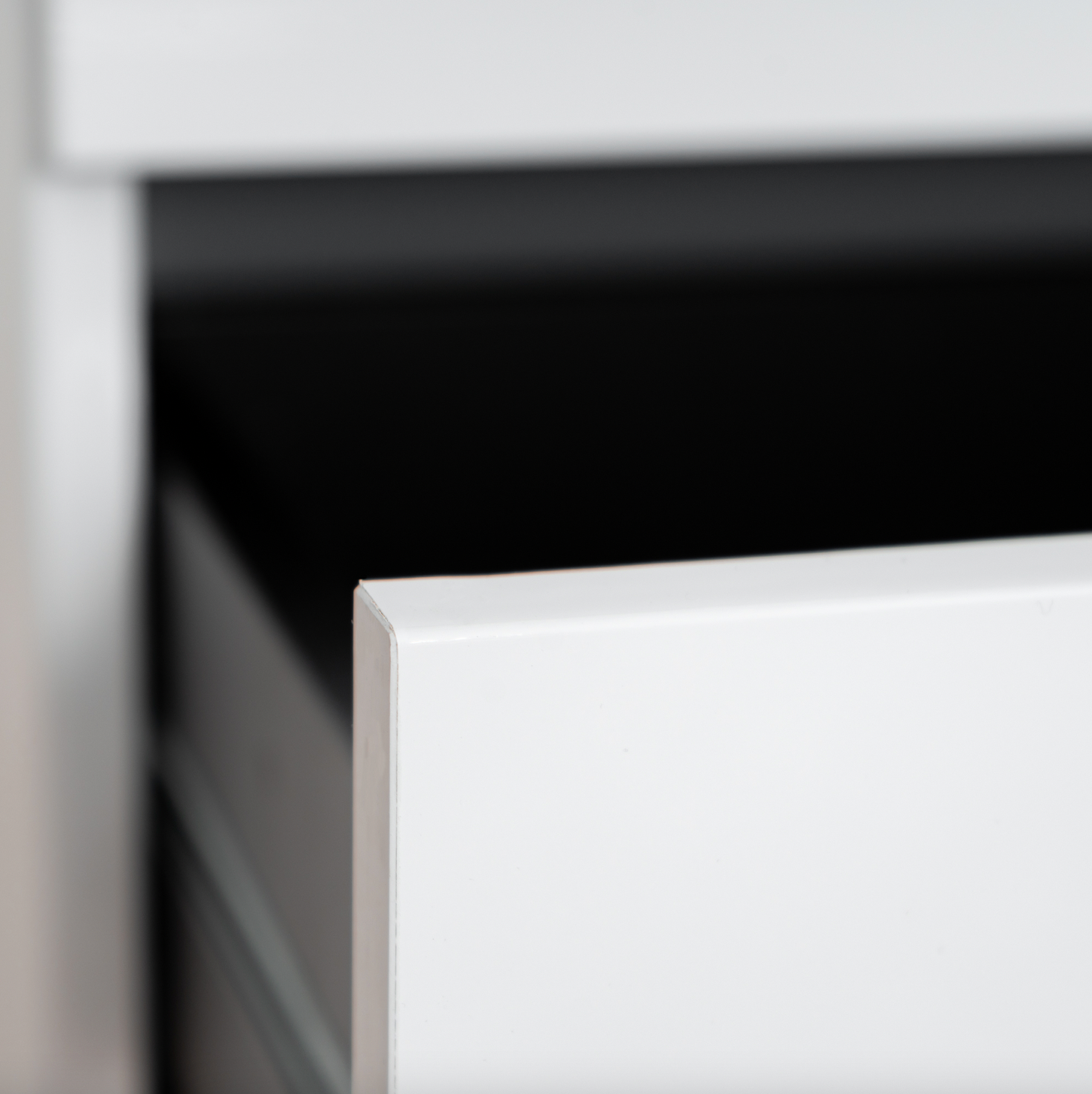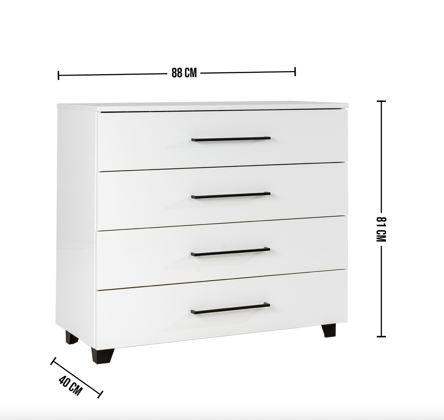Une jolie commode pour votre chambre ou votre séjour. Notre meuble CASSIOPE ajoutera du charme et de l'élégance à votre pièce grâce à son blanc/noir intense et brillant. Vous pouvez ranger tout ce que vous souhaitez comme vos vêtements, produits de beauté ou encore vos accessoires grâce à ses 4 grands tiroirs coulissants. Ce produit est fabriqué en France.
