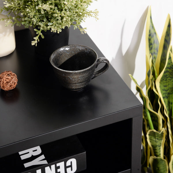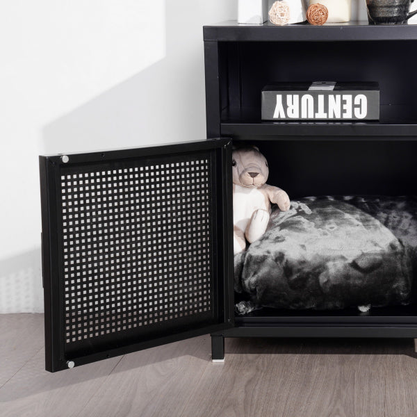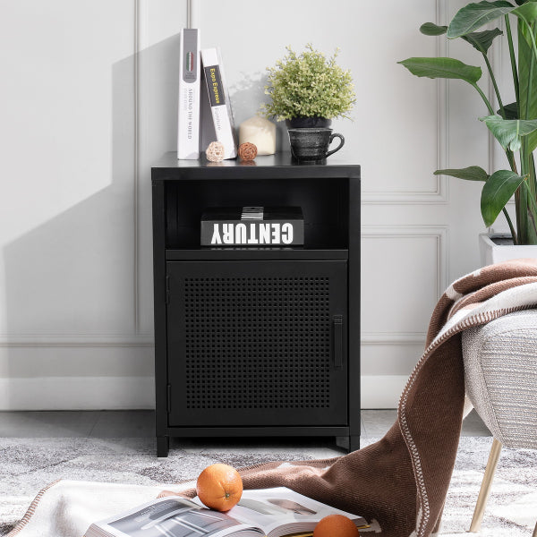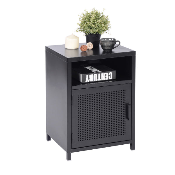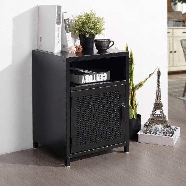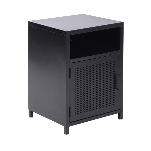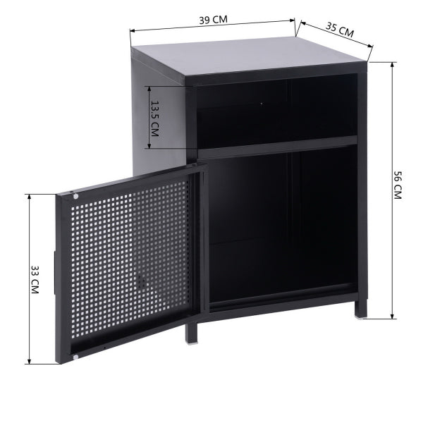 "Mesh metal cabinet, -size:39*35*56cm. -20*20*1.0mm Steel tube. 0.5mm Steel plate for top and side -in matt black powder coating, -with one mesh door and one shelf. -Packing: 1 pc/ctn. Brown box with line drawing. -Use door handle instead of knob"