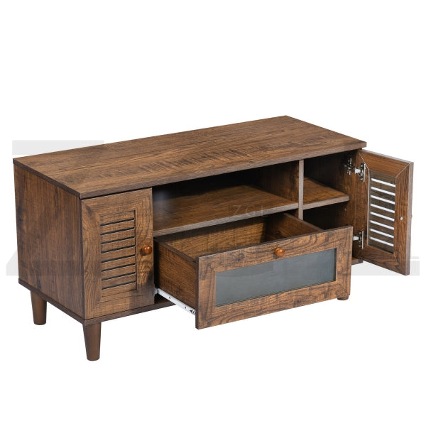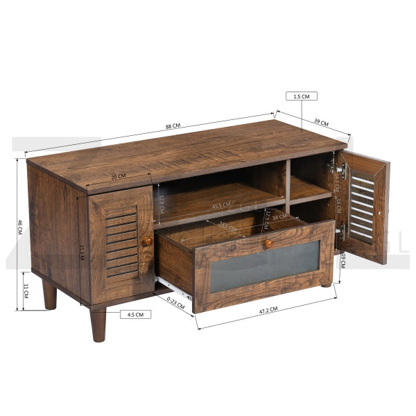 TV Stand . Product size: 88*39.5*46cm. Doors in 18mm PB double side with melamine paper ,Back panel and drawer bottom in 2.5mm MDF board,the rest in 15mm particle baord with melamine paper。Brown 200 pound cartons, e-commerce 3A drop box standard and e-commerce shipping standard. 1PC/1CTN.