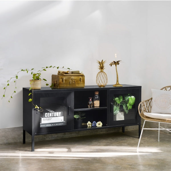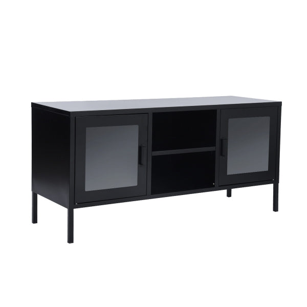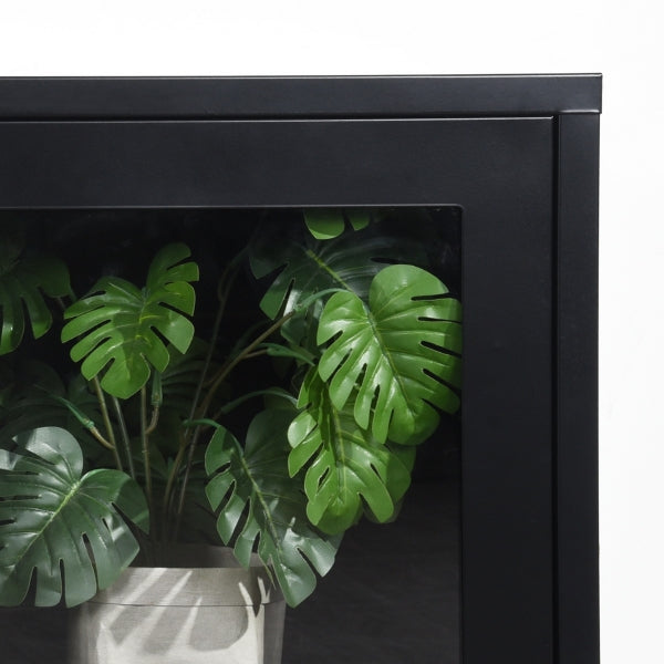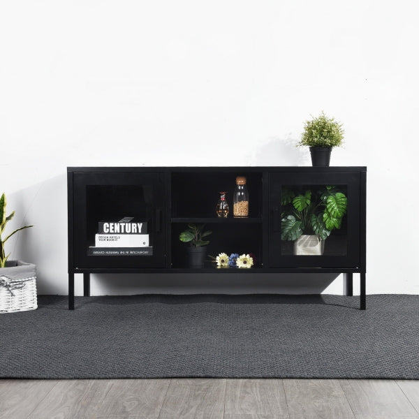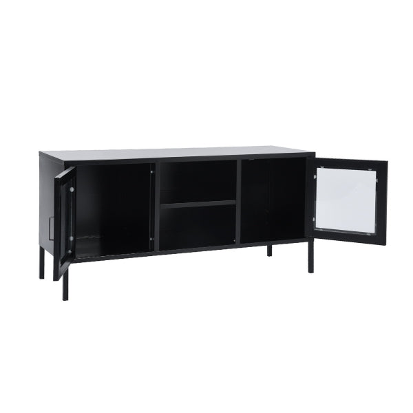 "Metal cabinet, -Size:120*40*58cm. -20*20*1.0mm Steel tube 0.6 mm. Steel plate for top and 0.5mm for side -in matt black powder coating, -with 2 wired glass doors, the rough side of glass on outside -Packing :1 pc/ctn. Brown box with line drawing."