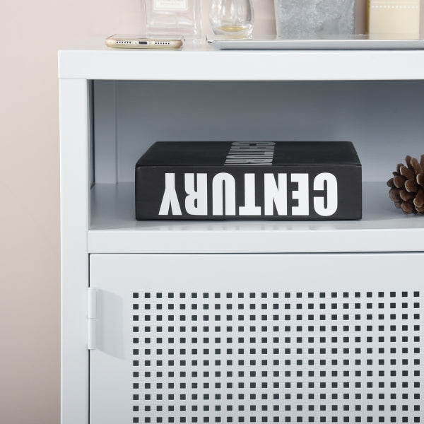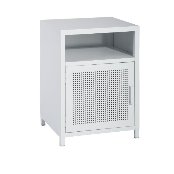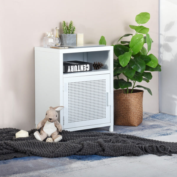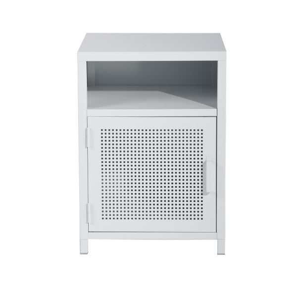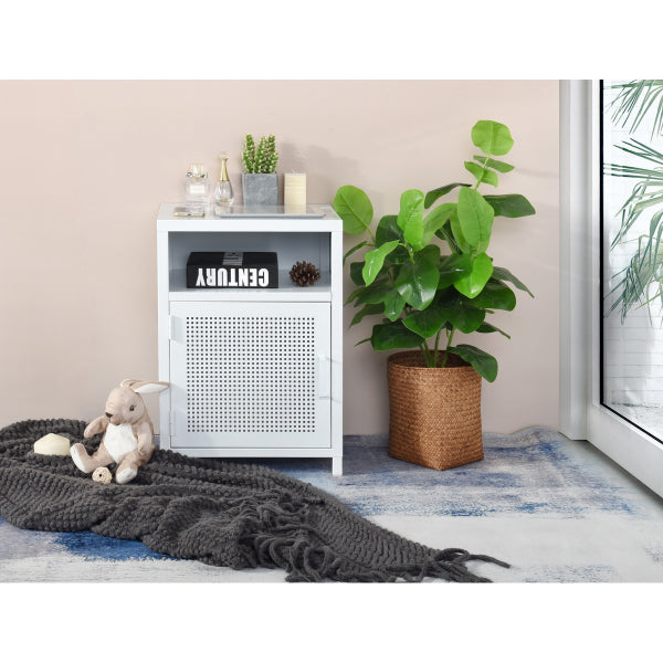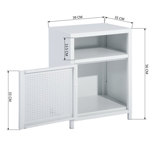 "Mesh metal cabinet, -size:39*35*56cm. -20*20*1.0mm Steel tube. 0.5mm Steel plate for top and side -in matt white powder coating, -with one mesh door and one shelf. -Packing: 1 pc/ctn. Brown box with line drawing. -Use door handle instead of knob" |