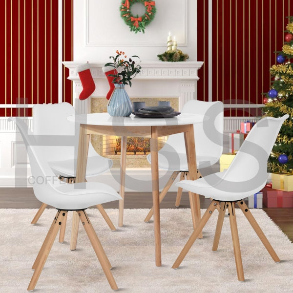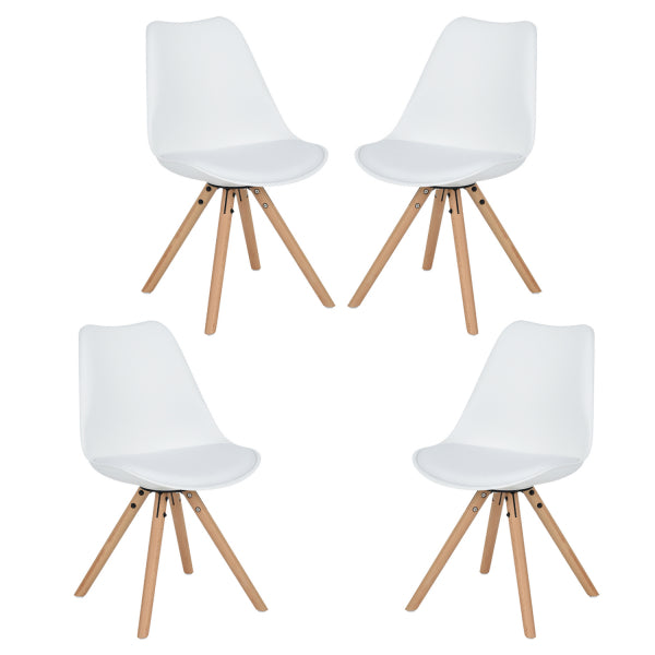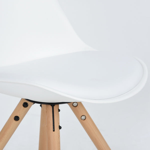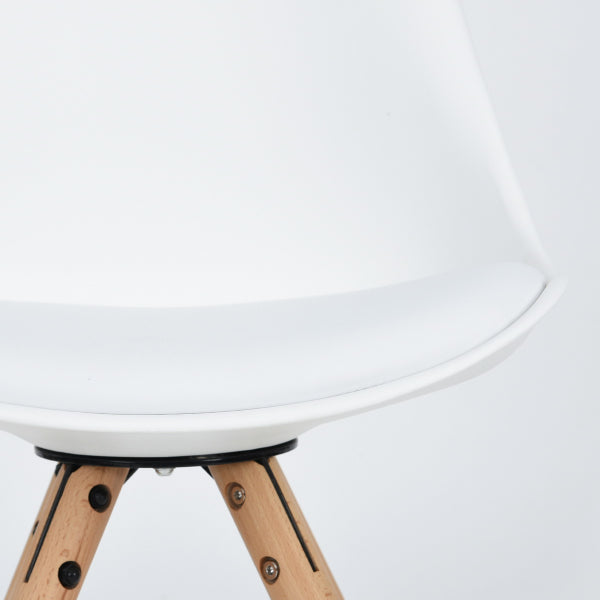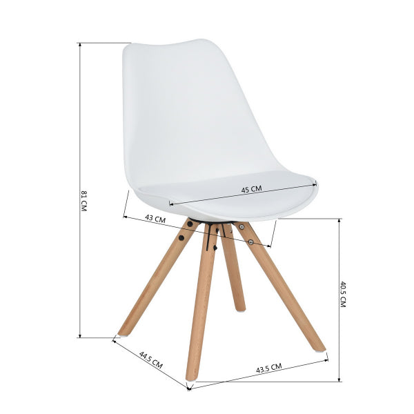 Dining chair.Overall size: W48.5*D53.5*H83.5cm. PP for seat and back, Seat depth: 42cm , seat height: 48cm, Cushion on seat, Metal base with black powder coating as connection of seatboard and feet , Oak chair feet, with white plastic pads . KD structure