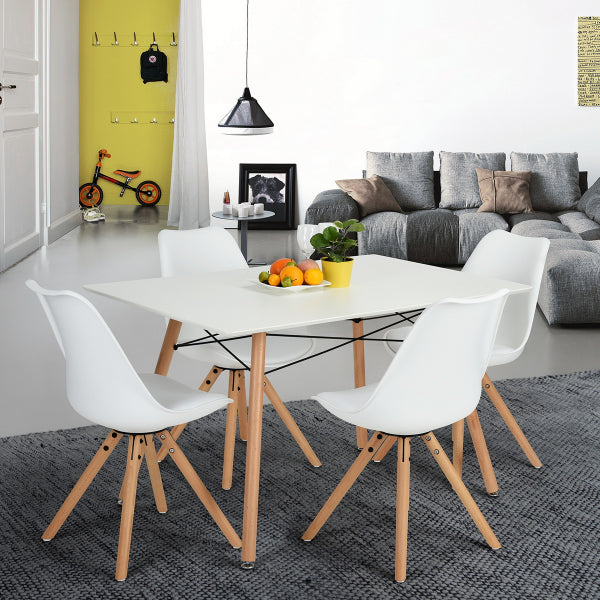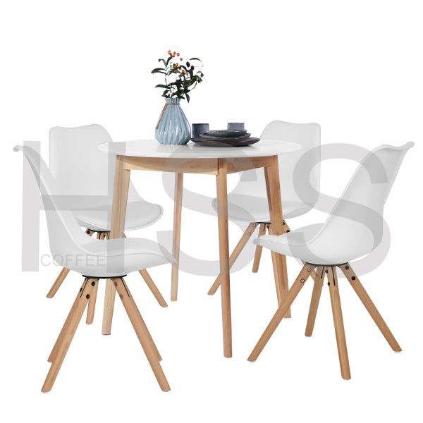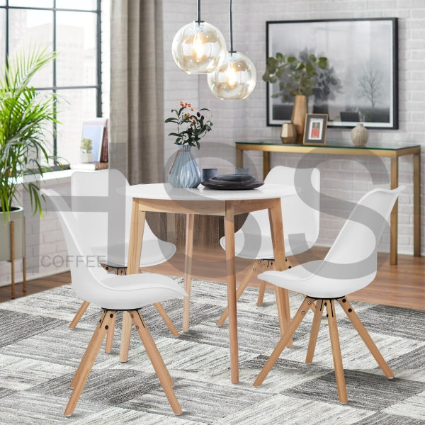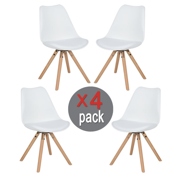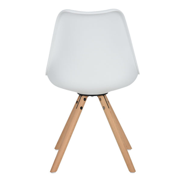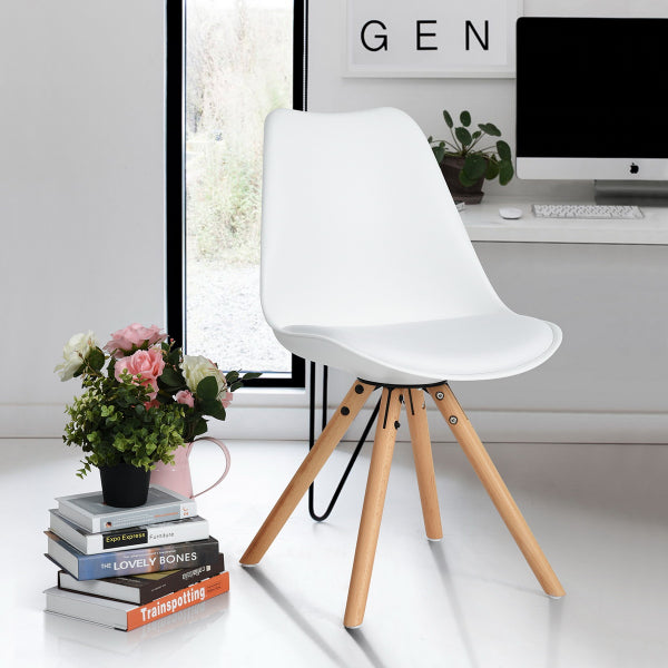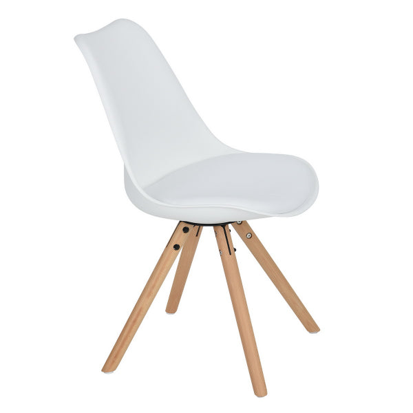 Dining chair.Overall size: W48.5*D53.5*H83.5cm. PP for seat and back, Seat depth: 42cm , seat height: 48cm, Cushion on seat, Metal base with black powder coating as connection of seatboard and feet , Oak chair feet, with white plastic pads . KD structure