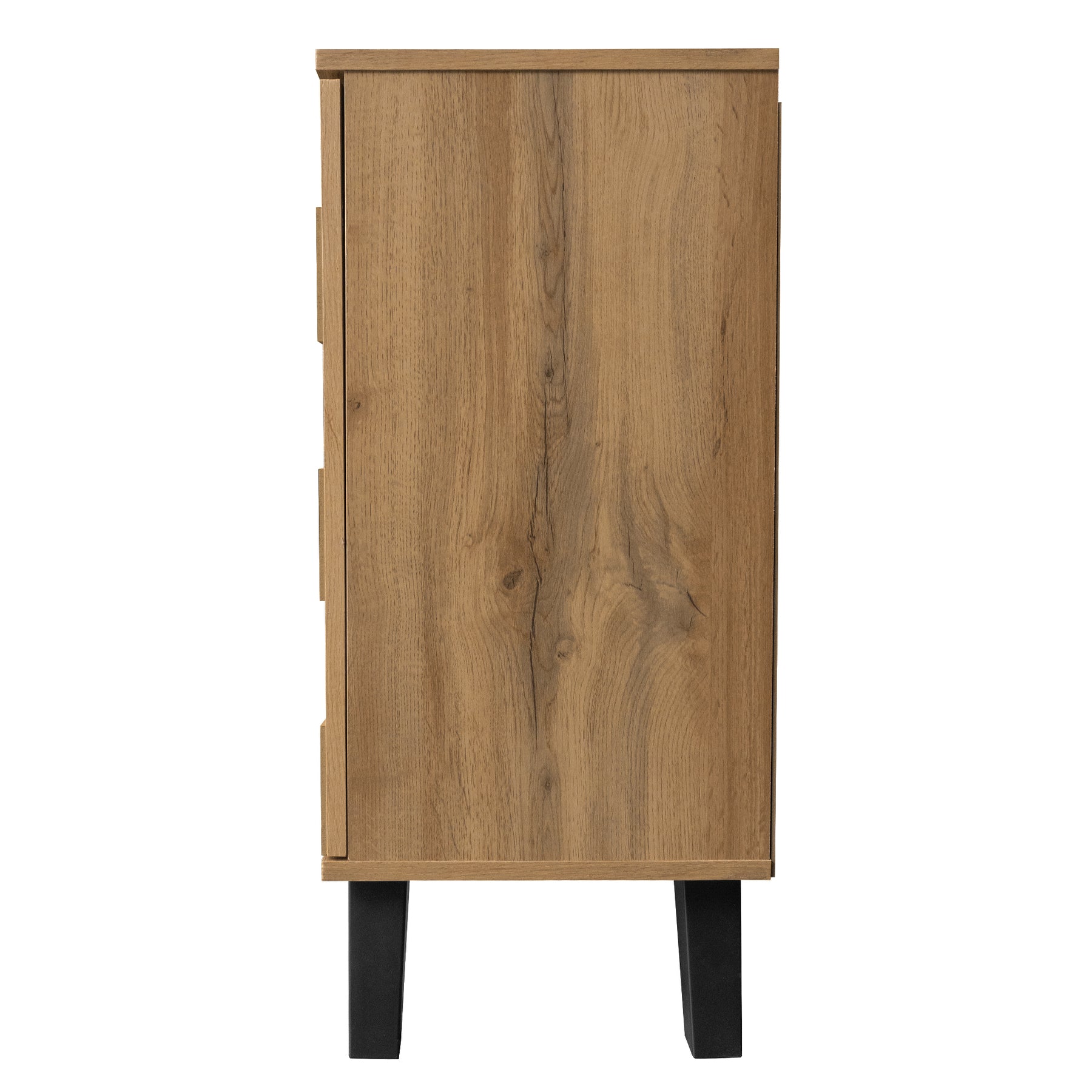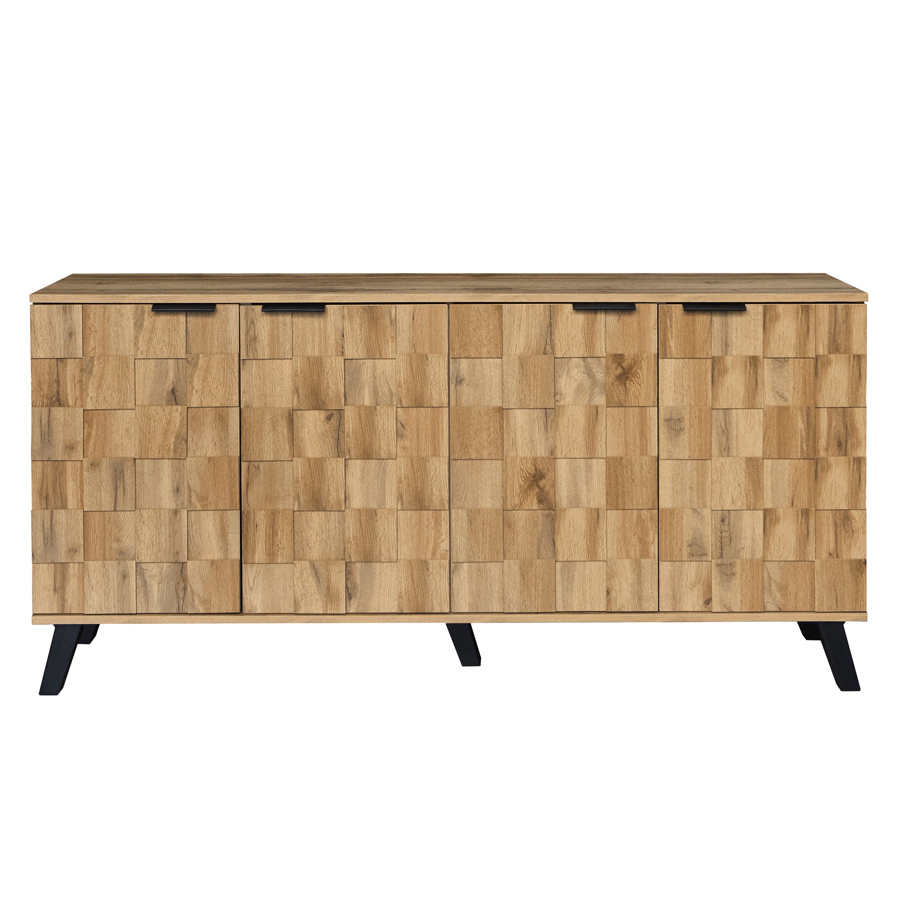 Buffet / Commode Moderne Effet Bois Naturel avec Motifs Géométriques, 4 Portes et Étagères Réglables (160.5x35.5x78cm) OCAERS