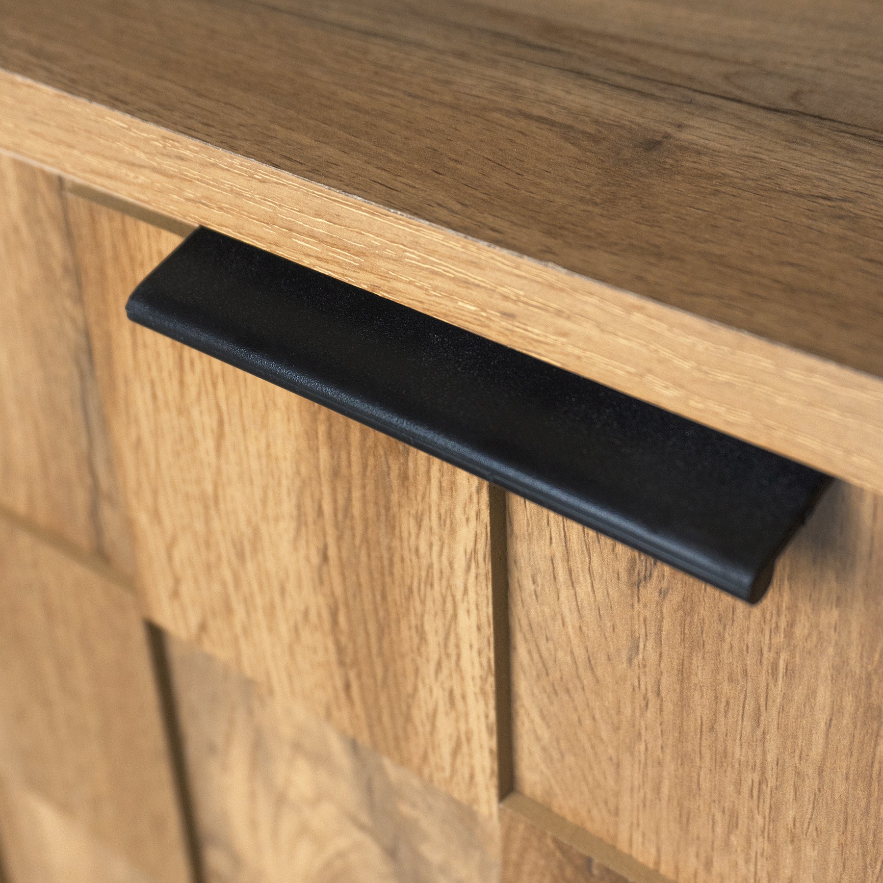 Ajoutez une touche d'élégance moderne et de fonctionnalité à votre intérieur avec ce buffet spacieux aux dimensions généreuses de 160,5 cm (L) x 35,5 cm (l) x 78 cm (H). Son design raffiné combine la chaleur du bois naturel avec des motifs géométriques texturés sur les quatre portes, complétés par des poignées et des pieds en métal noir mat, créant une esthétique contemporaine et polyvalente. À l'intérieur, des étagères réglables offrent un espace de rangement généreux et adaptable pour la vaisselle, les livres ou les effets personnels, répondant à une variété de besoins organisationnels dans votre salle à manger, salon ou chambre. Fabriqué à partir de panneaux de particules de haute qualité, ce meuble assure une construction robuste et durable pour une utilisation quotidienne. Son design simple et universel lui permet de s'intégrer harmonieusement dans n'importe quel décor, faisant de ce buffet un ajout pratique et esthétique à votre maison.