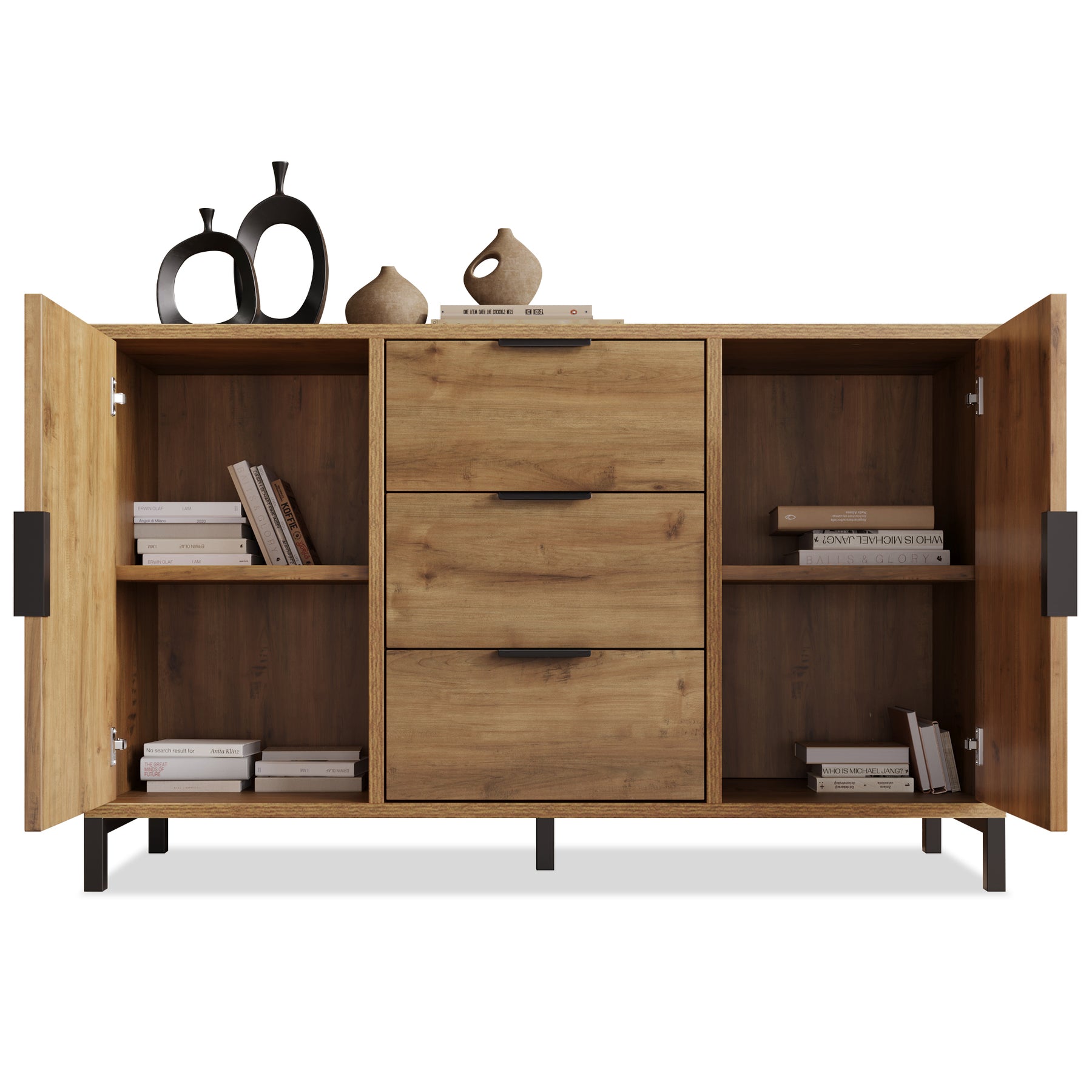 • Rangement Polyvalent et Réglable : Dotée de 3 tiroirs centraux spacieux et de 2 compartiments derrière des portes, chacun avec une étagère réglable en hauteur (3 positions), cette commode offre un espace de rangement personnalisable pour une organisation optimale de vos biens.