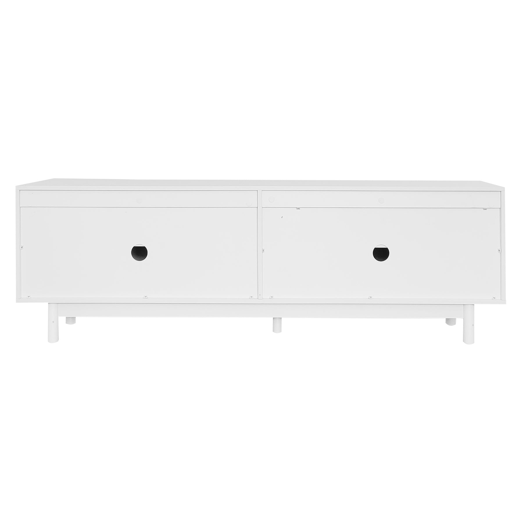 • Design Élégant et Minimaliste : Ce meuble TV arbore un design épuré en blanc pur, complété par des pieds en bois massif blanc, s'intégrant parfaitement dans tout intérieur moderne.