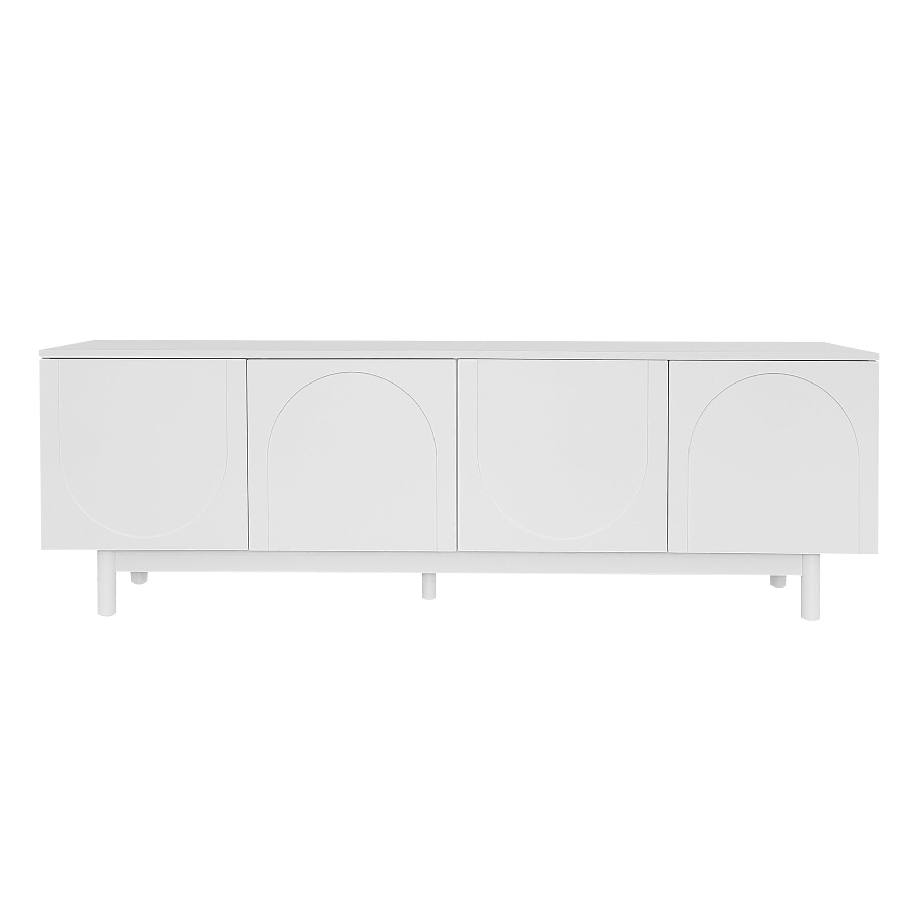 Ce meuble TV de 175 cm x 38 cm x 56 cm séduit par son design épuré et son élégante finition blanc pur. Les pieds en bois massif blanc renforcent son allure minimaliste et sa stabilité. Il est équipé de quatre portes au design unique qui s'ouvrent par simple pression, éliminant le besoin de poignées pour un look particulièrement moderne et sophistiqué. À l'intérieur de chaque porte, une étagère réglable en hauteur offre une polyvalence de rangement pour des objets de différentes tailles, garantissant ainsi un espace de vie toujours ordonné et organisé.