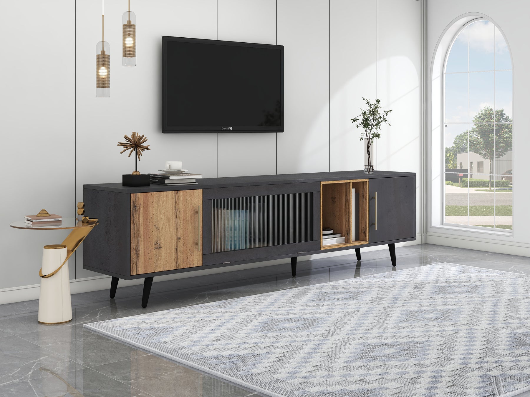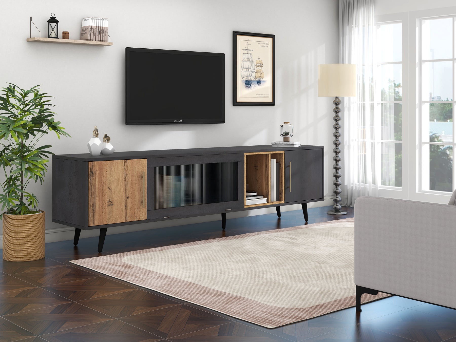 Meuble TV Élégant Gris et Bois Foncé avec Porte Abattante en Verre Changhong et Rangement Intégré (200x40x55.5cm - Pour TV 90"+) COVUNS