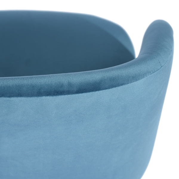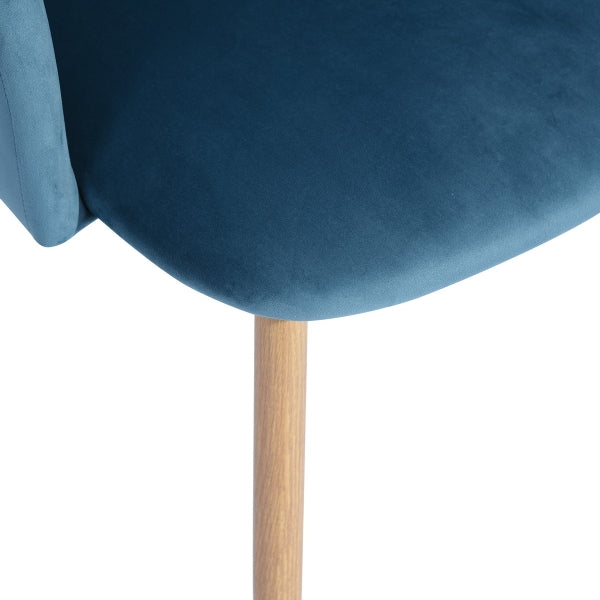 LEISURE CHAIR; Product size: W53.5*D59*H82CM; Seat and back in Blue#48 velvet.Metal Leg in wooden color of Transfer printing.Seat width: 48CM; Seat depth: 46CM; BACK Height: 38CM; 1PC/CTN; Velvet material fullfill Reach test requirement; Brown mailbox in line draw.